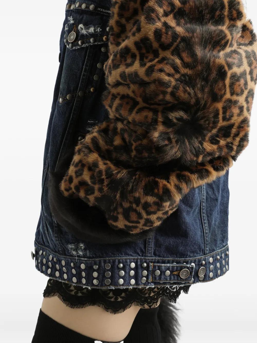 dark blue distressed denim leopard-print sleeves metallic-stud embellishments lace trim faux-fur trim