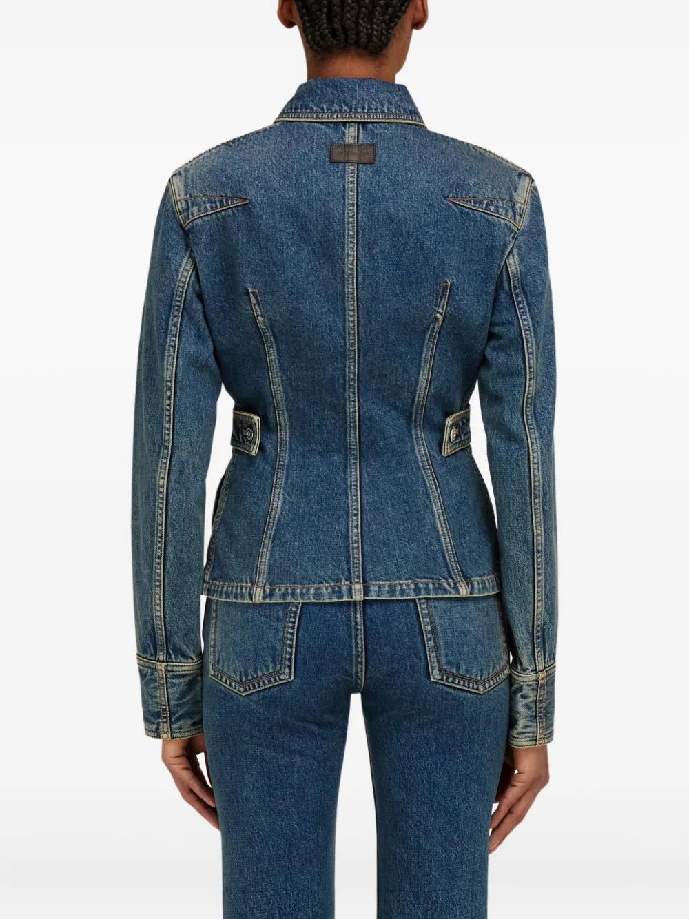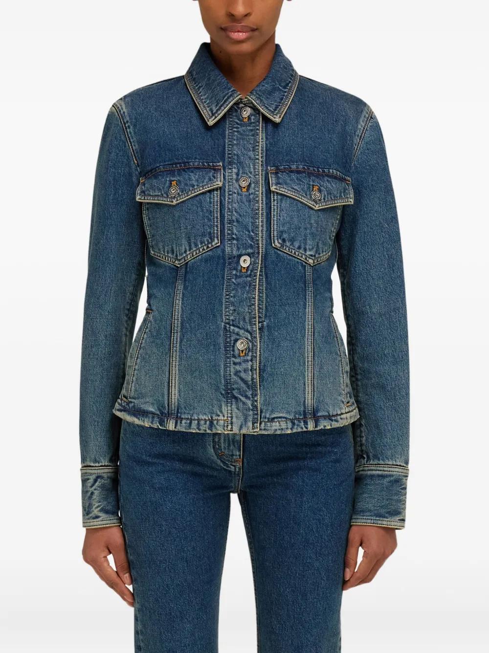 light blue front button fastening chest flap pockets fitted waistline long sleeves