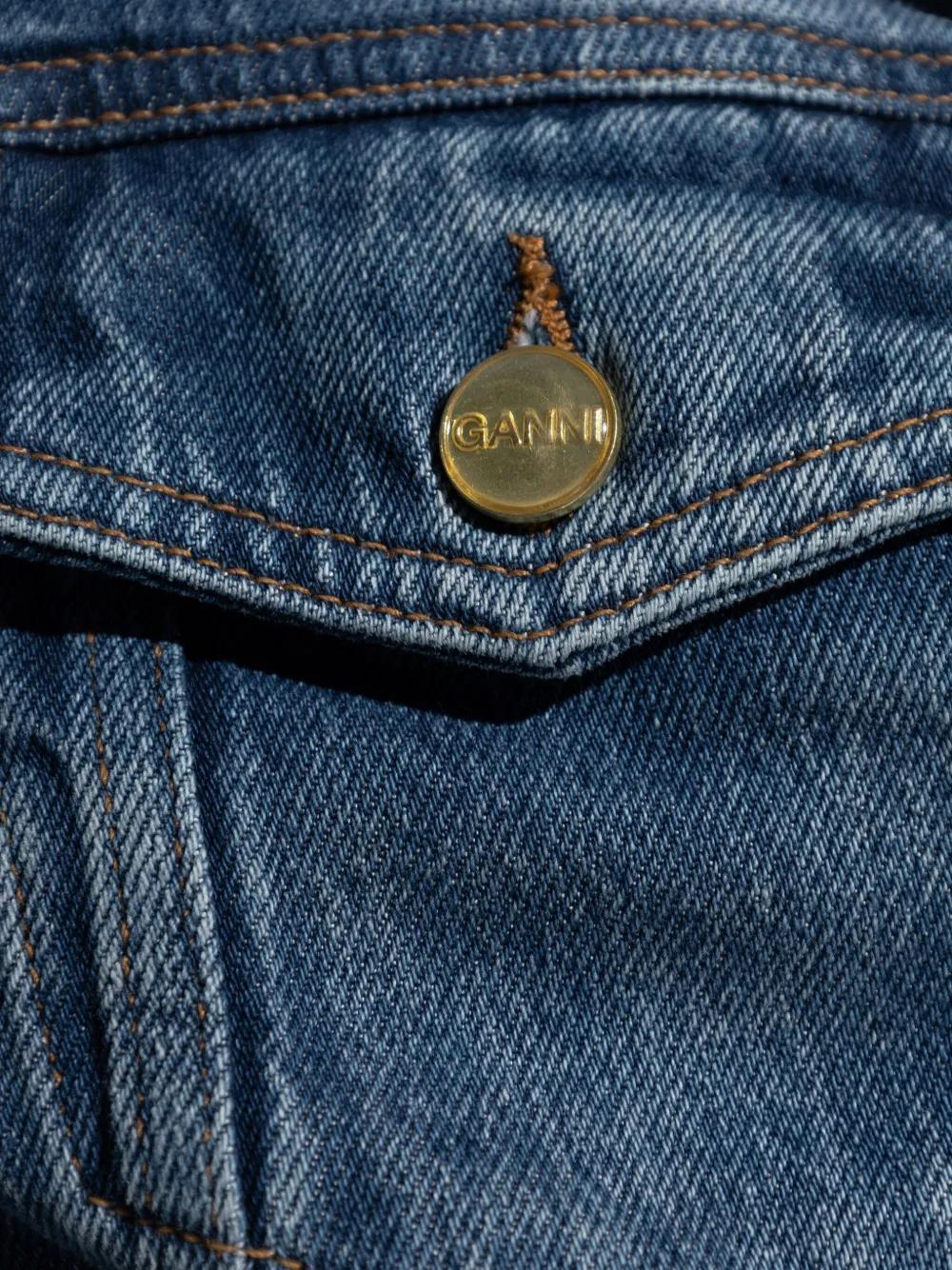 indigo blue front button fastening two chest flap pockets belt loops whiskering effect