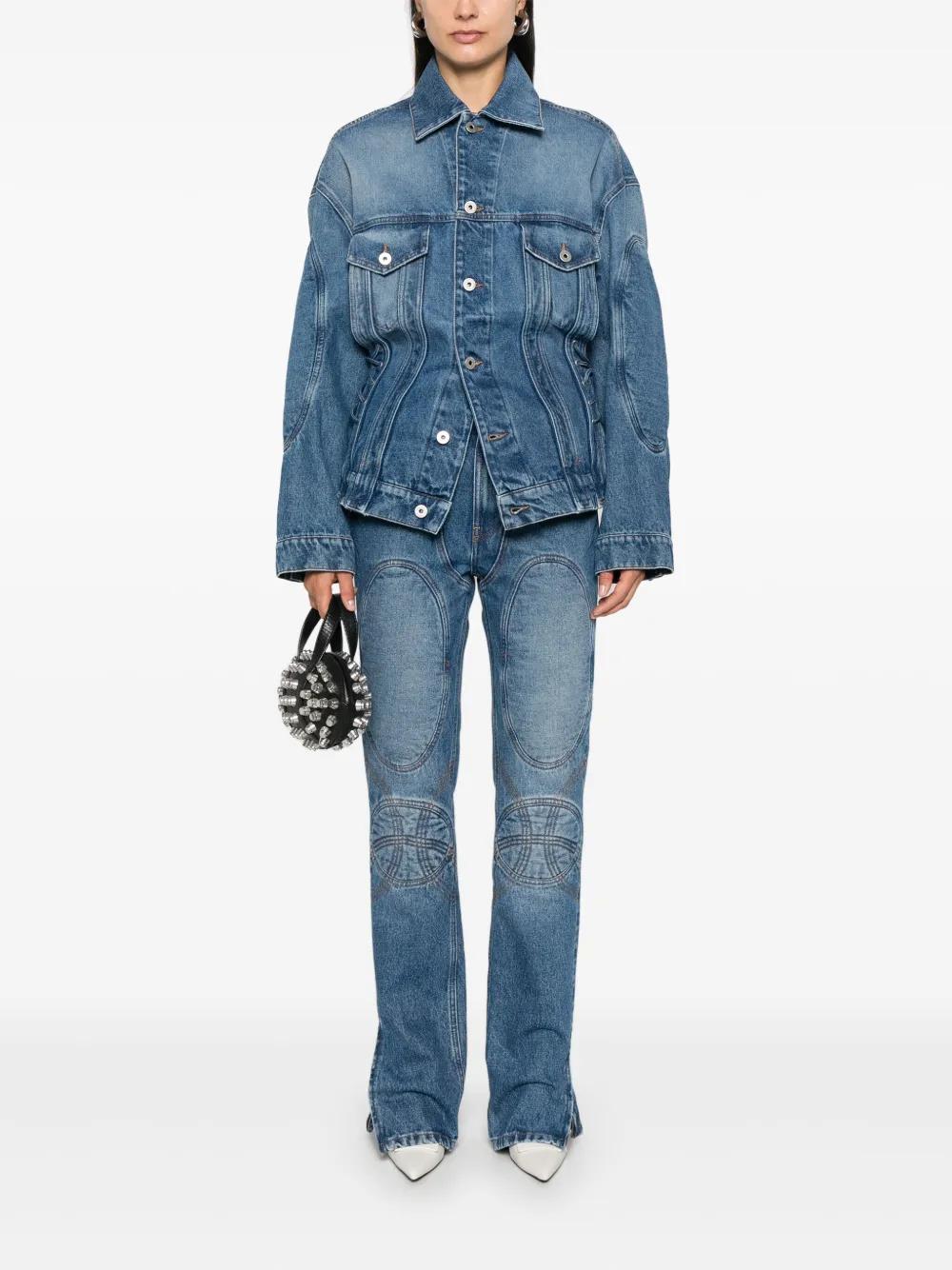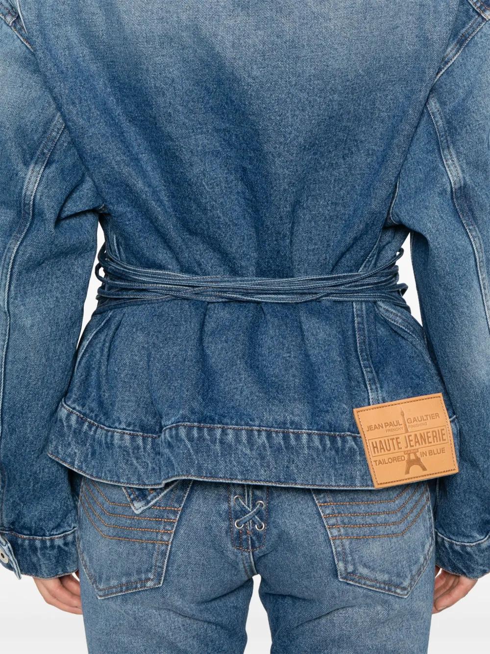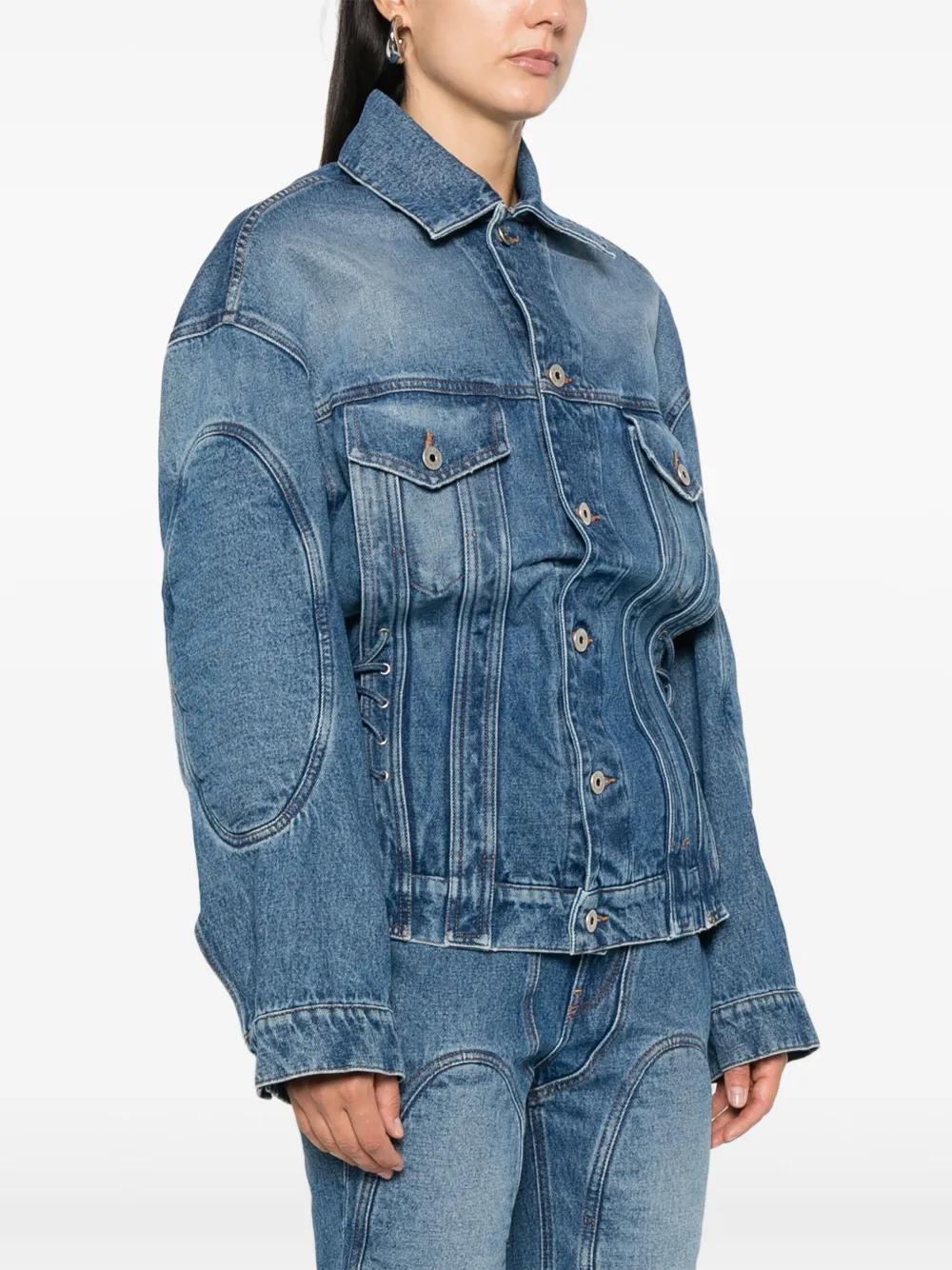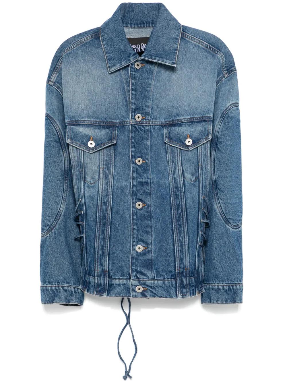 blue cotton denim contrast stitching side lace-up fastening corset style front button fastening classic collar drop shoulder long sleeves buttoned cuffs chest button fastening patch pocket two side welt pockets logo patch to the rear straight hem