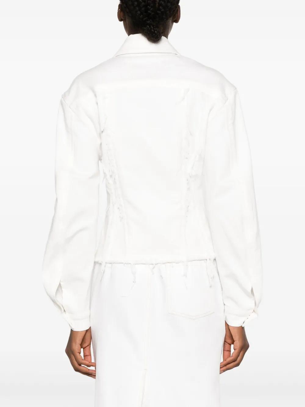 white stretch-cotton denim frayed detailing classic collar front button fastening long puff sleeves buttoned cuffs two chest flap pockets raw-cut hem