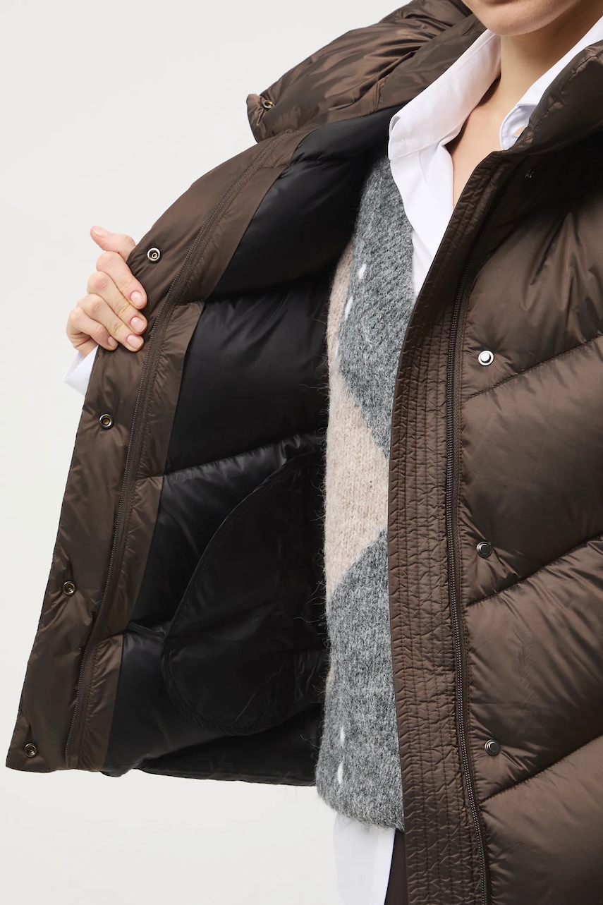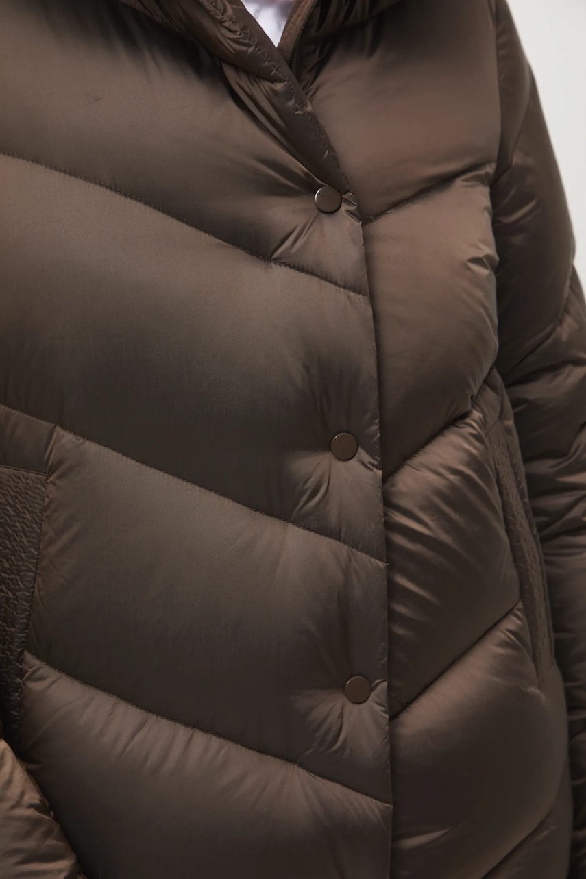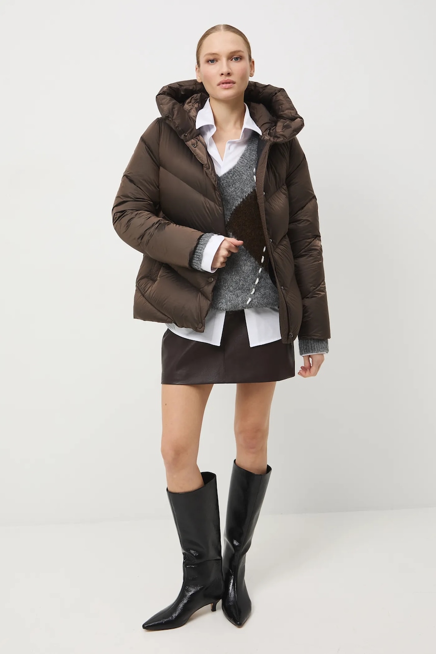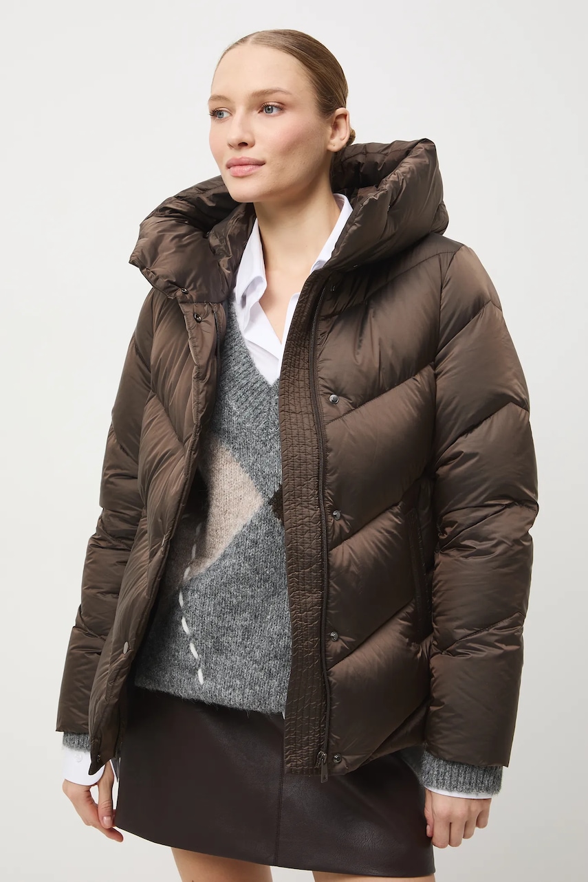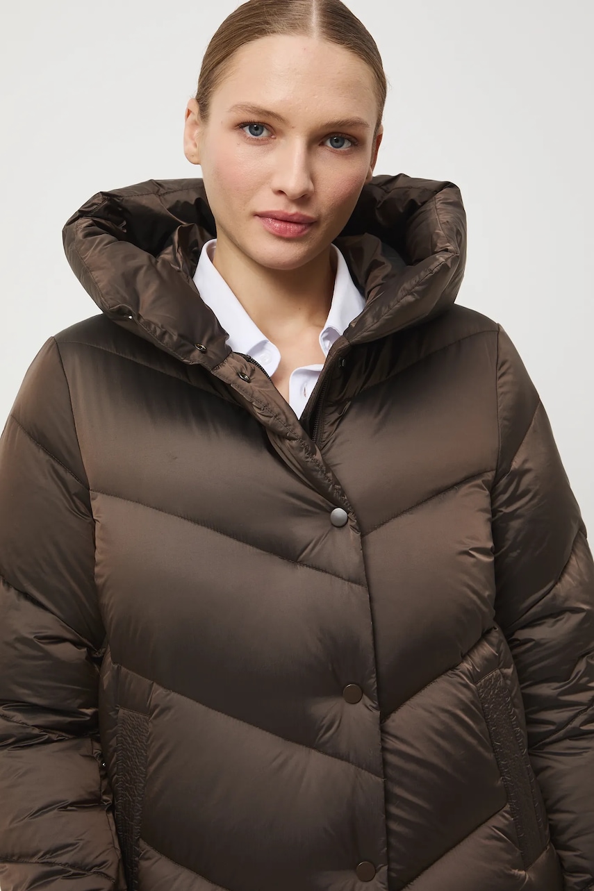 - Fason oversize. - Zapięcie na suwak i zatrzaski. - Podwyższony kołnierz. - Model z kapturem. - Dwie wsuwane kieszenie boczne. - Ocieplony model na podszewce. - Pikowany model. - Wypełnienie z naturalnego puchu i pierza. - Długość rękawa: 66 cm. - Długość: 70 cm. - Szerokość w biuście: 61 cm. - Szerokość w barkach: 43,5 cm. - Wymiary podane dla rozmiaru: S.