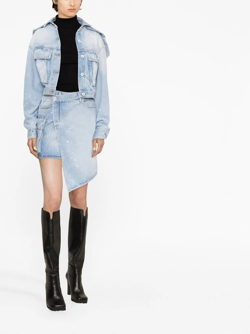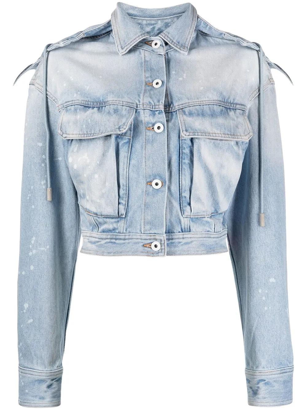 light blue cotton front button fastening cropped epaulettes paint splatter detail distressed finish two chest flap pockets