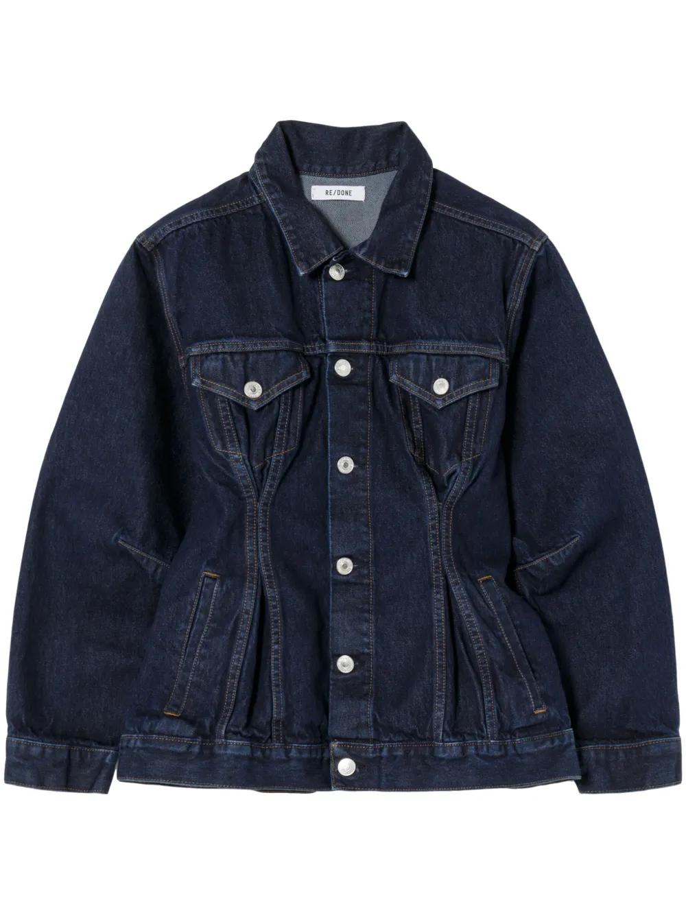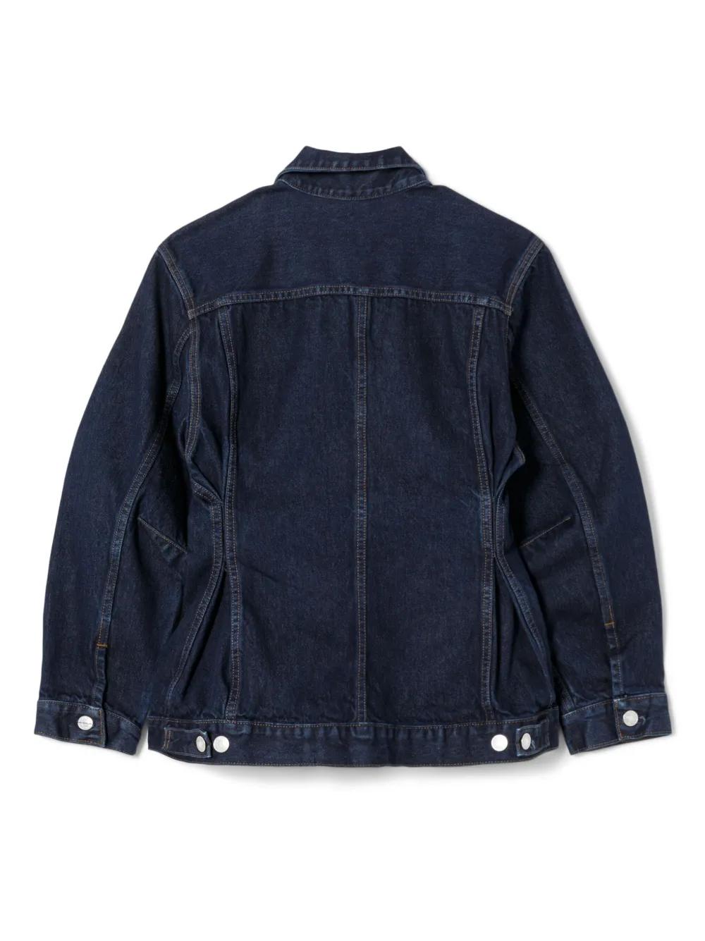 indigo blue cotton denim pintuck detailing spread collar front button fastening two front flap pockets two side inset pockets long sleeves buttoned cuffs straight hem
