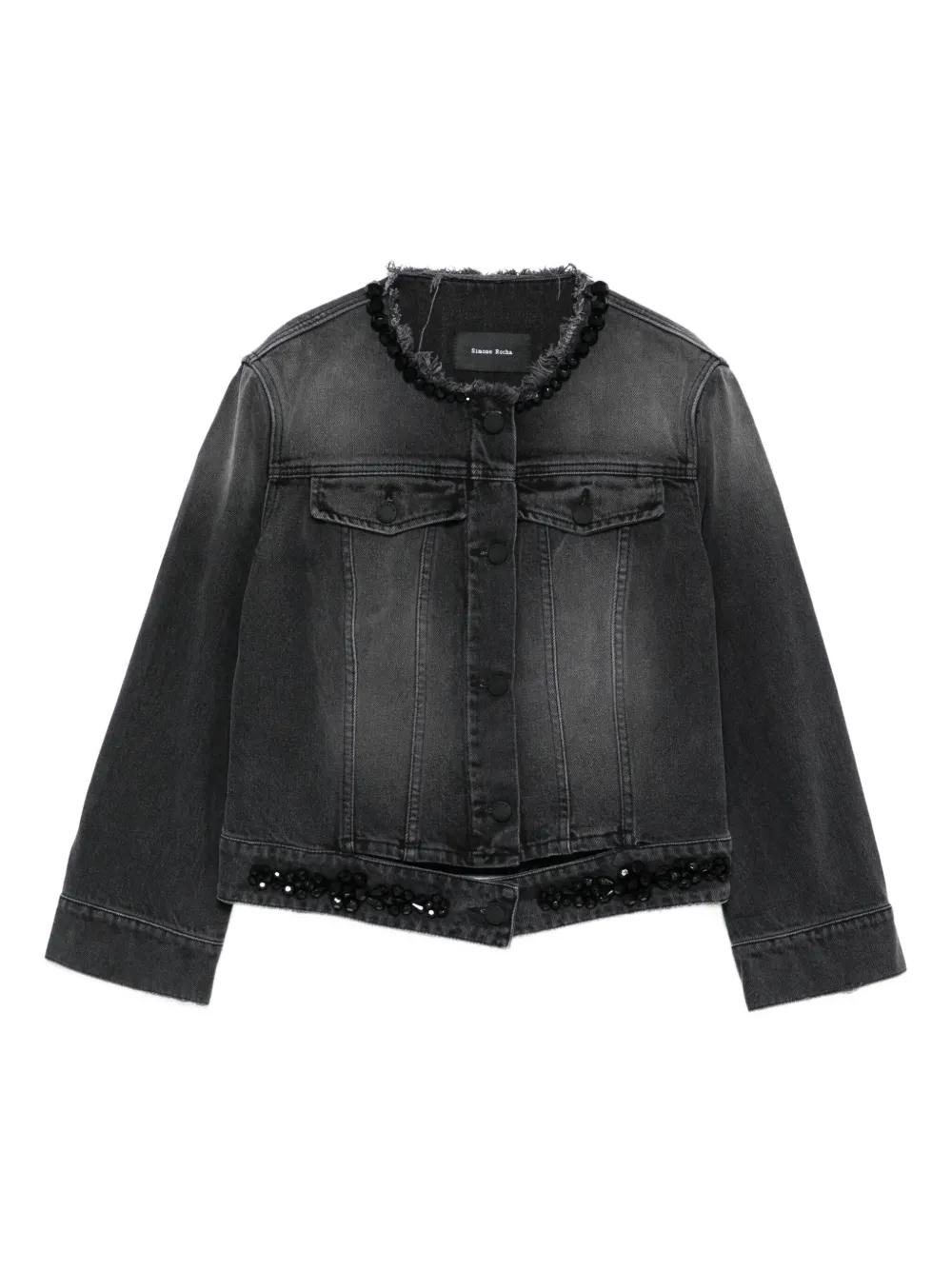 black beaded embellishment frayed trim button fastening front pockets long sleeves