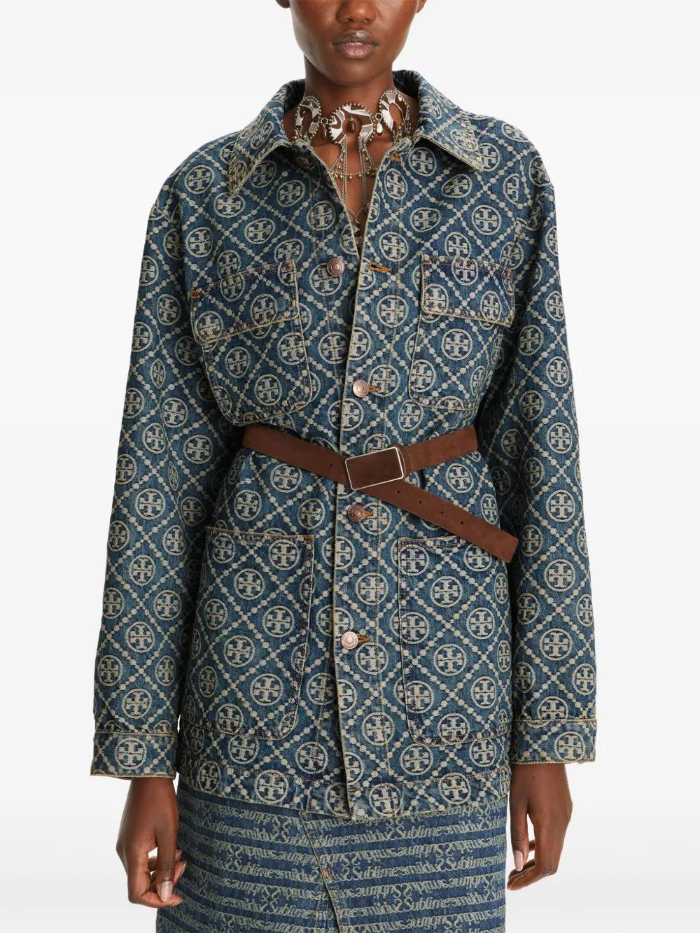 indigo blue front button fastening two chest flap pockets two front patch pockets monogram pattern