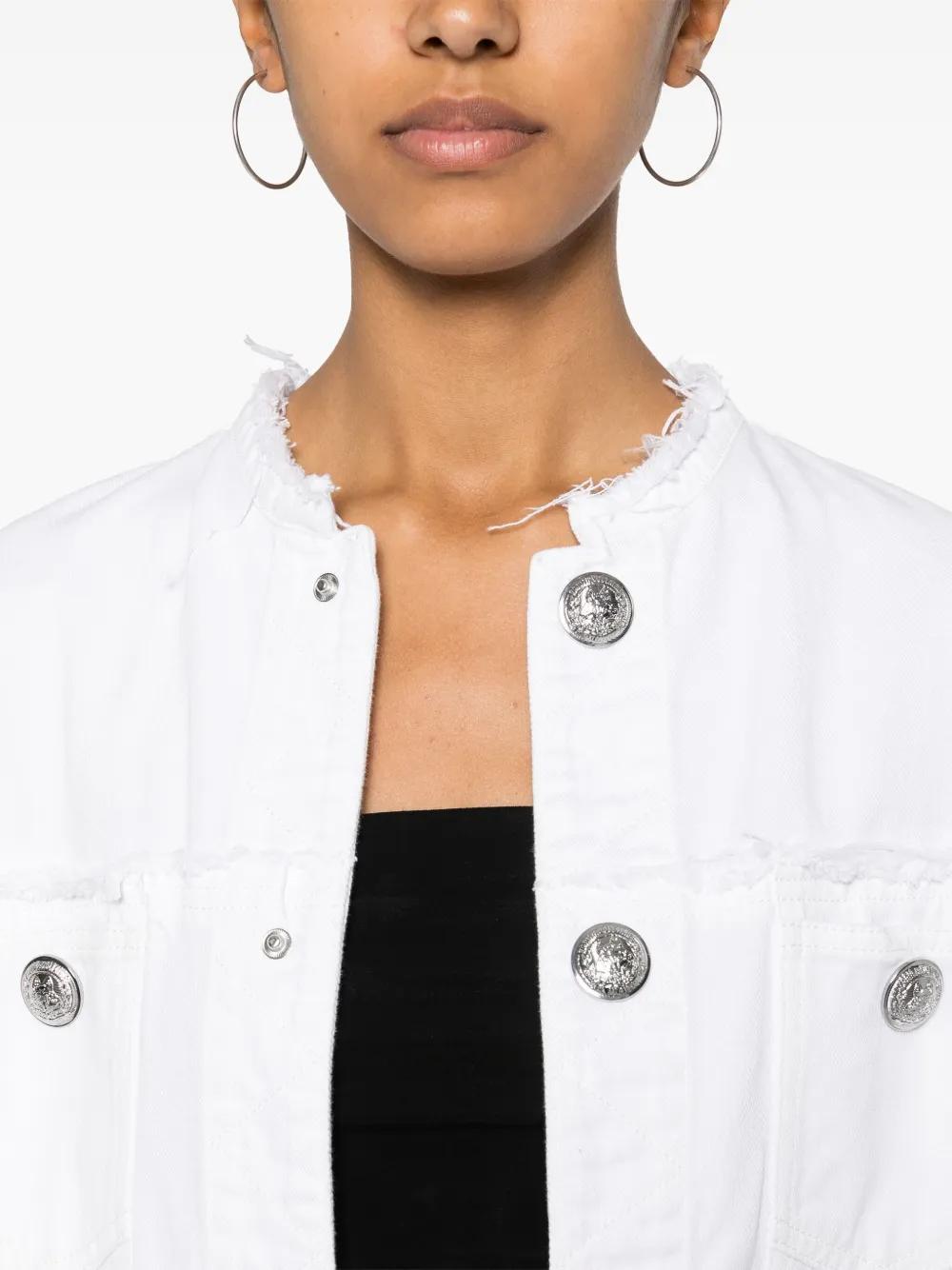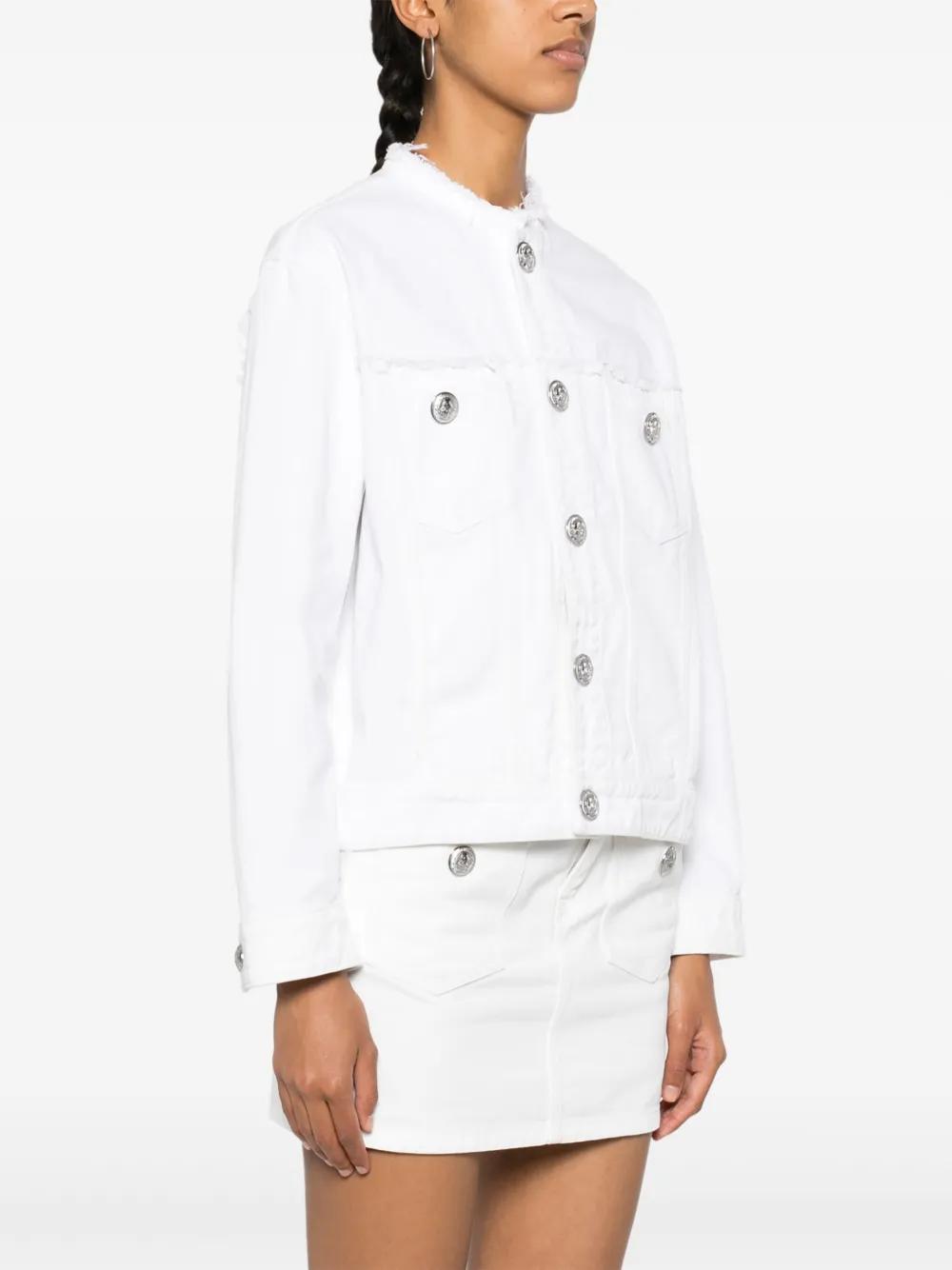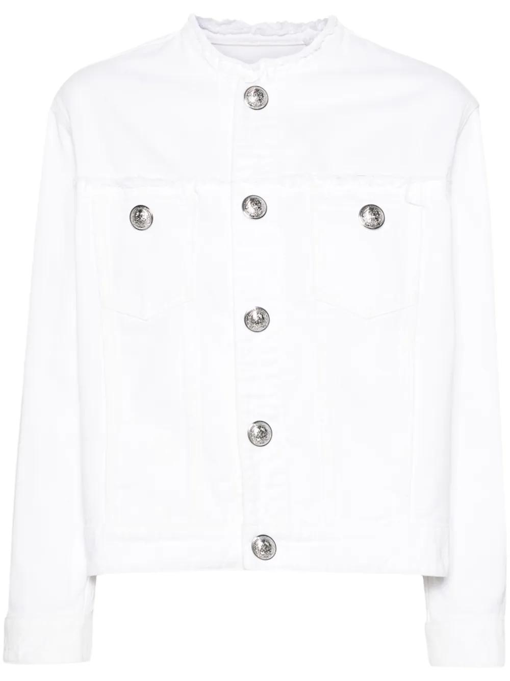 white cotton denim frayed detailing panelled design rounded collar long sleeves with press-stud fastening cuffs two chest press-stud fastening patch pockets waist tabs straight hem embossed silver-tone buttons front press-stud fastening