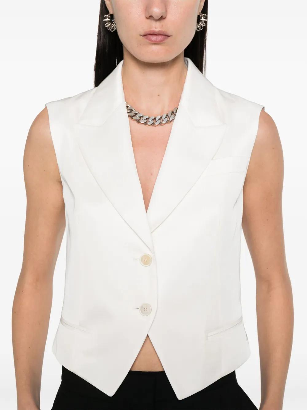 white twill weave tailored design peak lapels chest welt pocket sleeveless two front jetted pockets asymmetric hem full lining front button fastening