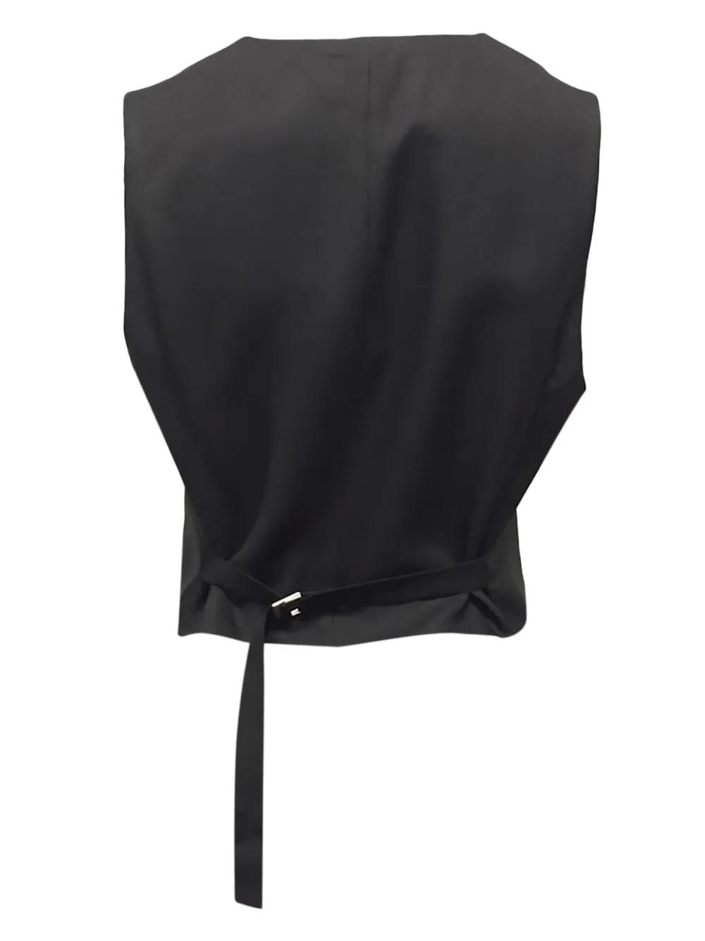 black v-neckline button fastenings front pockets martingale to the rear sleeveless