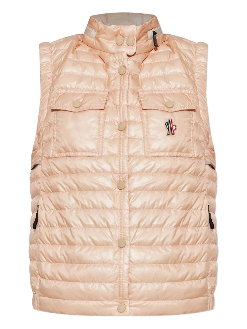 powder pink front press-stud fastening two chest flap pockets two side zip-fastening pockets logo patch at the chest