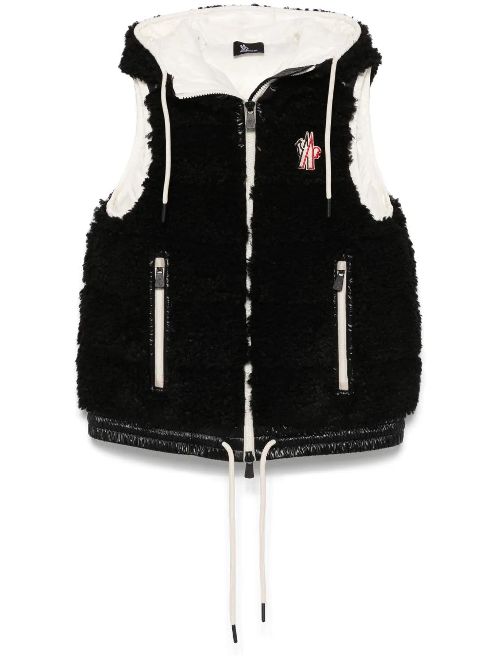 black fleece texture water-repellent finish padded design goose down-feather filling front two-way zip fastening drawstring hood funnel neck sleeveless contrasting laqué trim embroidered logo at the chest two side zip-fastening pockets full contrast lining elasticated hem drawstring hem
