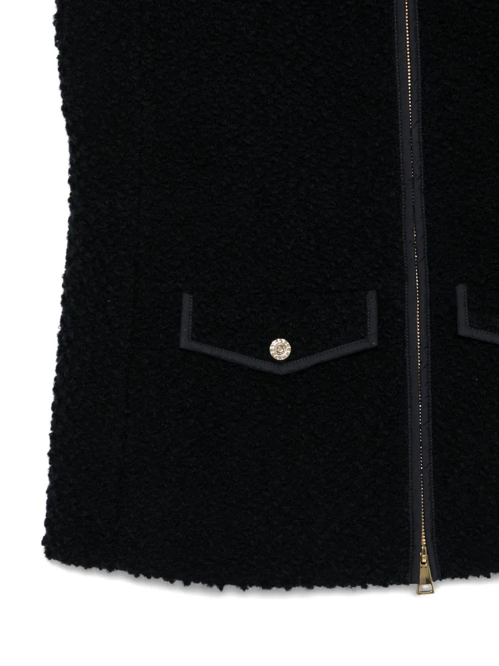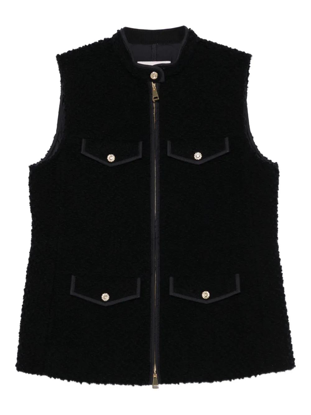 black textured fabric zip fastening multi pocket gold-tone buttons sleeveless