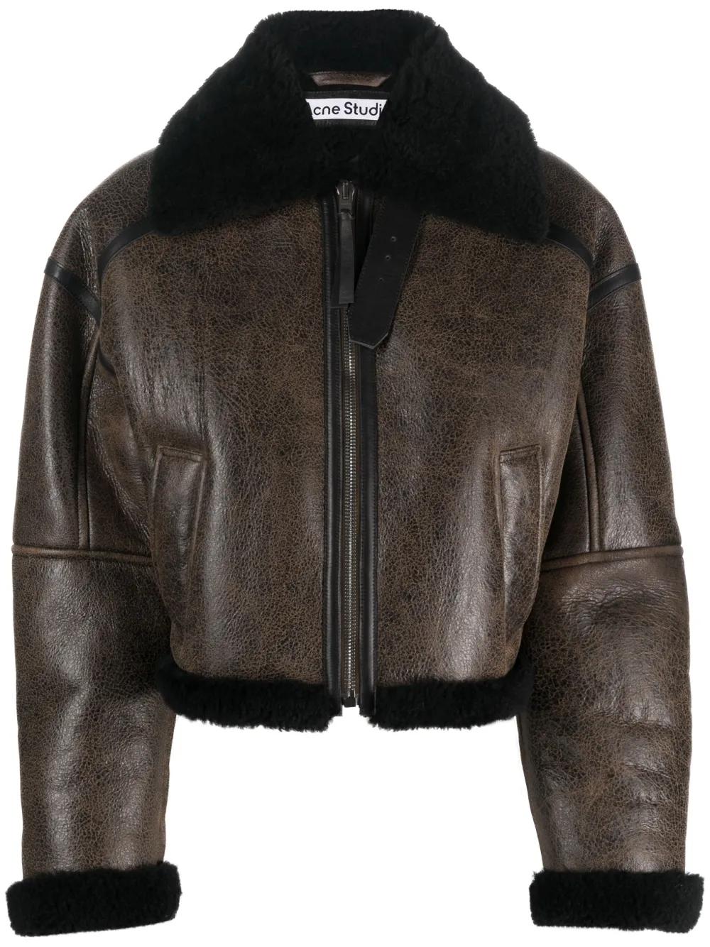 brown/black calf leather shearling collar shearling trim front zip fastening long sleeves two side slash pockets cropped
