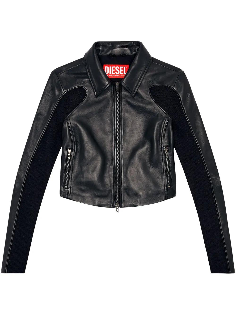 black lambskin panelled design classic collar front two-way zip fastening two side zip-fastening pockets long sleeves straight hem cropped