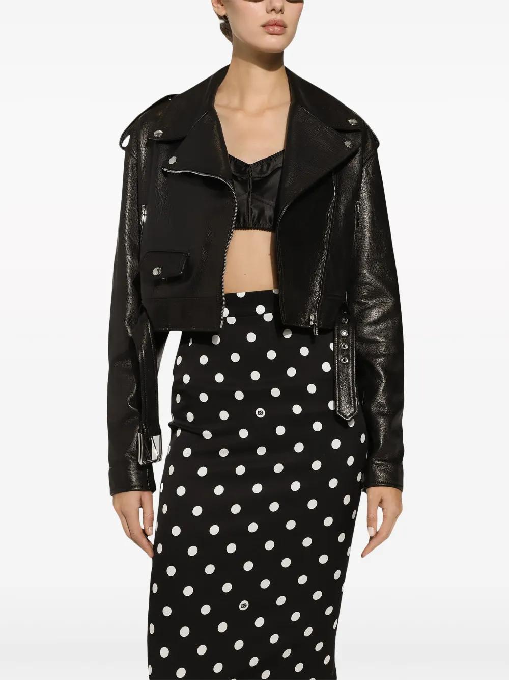 black nappa leather notched collar off-centre front zip fastening epaulettes long sleeves front flap pocket two side zip-fastening pockets belted waist cropped silver-tone hardware