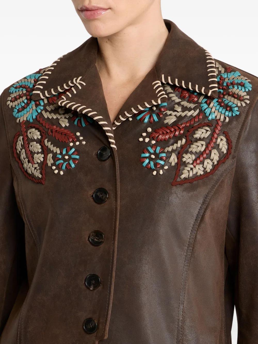 brown leather paisley embroidery notched collar front button fastening long sleeves patch pockets curved hem