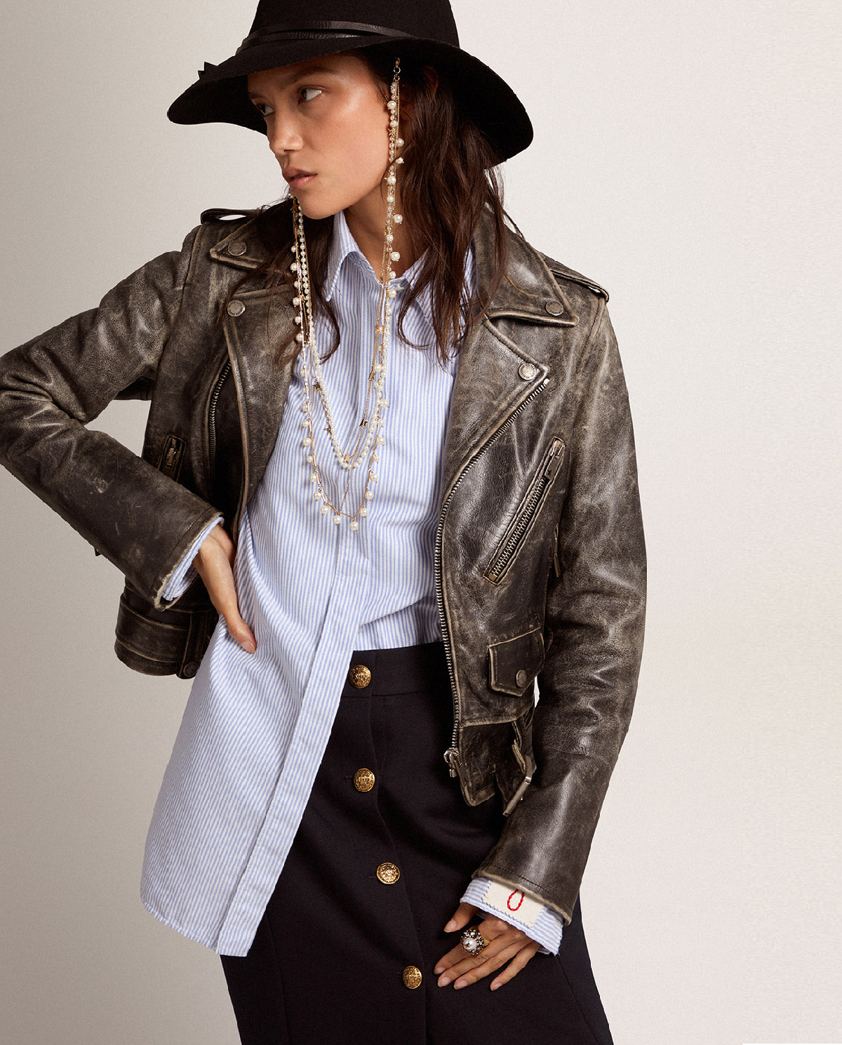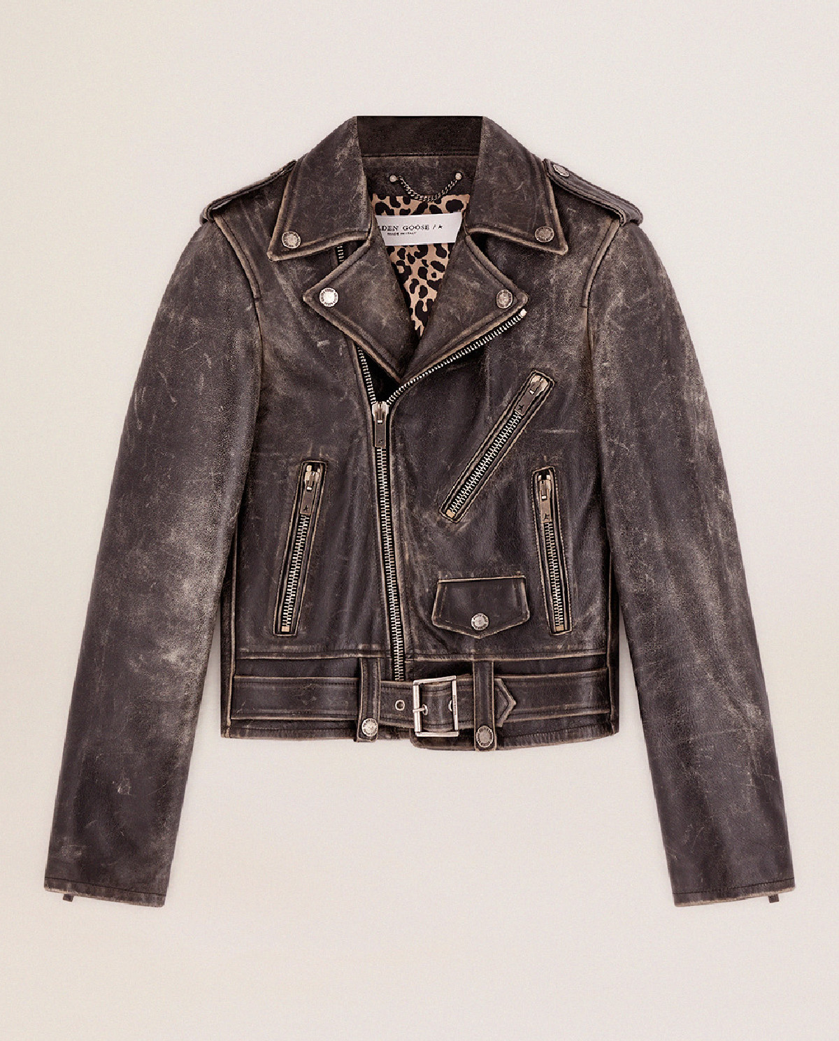 <ul> <li>stylowa kurtka damska typu biker od marki Golden Goose</li> <li>w czarnym kolorze z efektem znoszenia</li> <li>dopasowany krój</li> <li>asymetryczne zapięcie za pomocą suwaka</li> <li>trzy zapinane kieszenie przednie</li> <li>jedna kieszonka na zatrzask</li> <li>dół kurtki zakończony paskiem z klamrą</li> <li>z tyłu kurtki na górze dwie metalowe gwiazdki i dwa suwaki na dole po bokach</li> <li>wykonana w 100% z wysokiej jakości skóry bydlęcej z dbałością o detale</li> </ul>