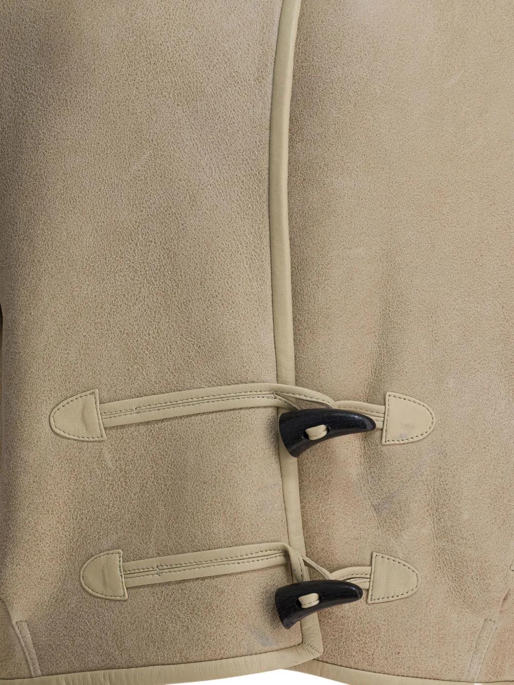 beige lamb fur lining hooded toggle fastening panelled design trimmed edges