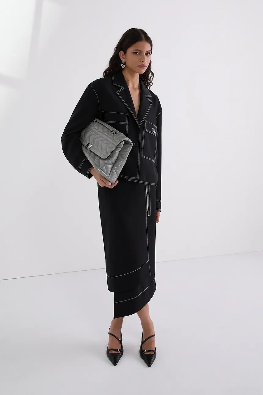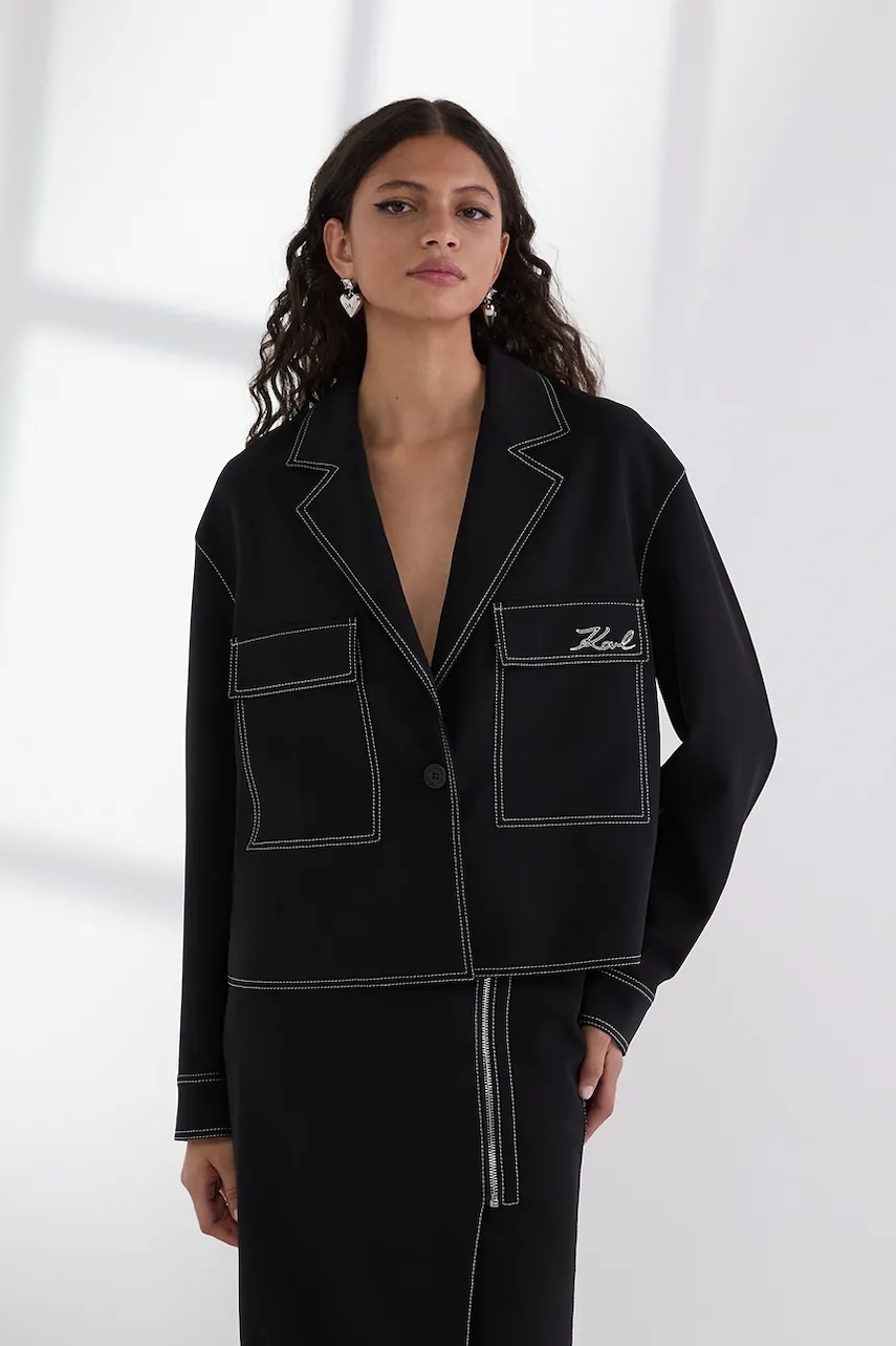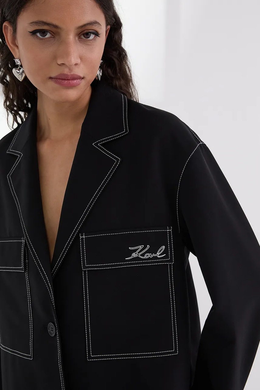- Ten model został częściowo wykonany z poliestru z recyklingu. - Jednorzędowe zapięcie na guziki. - Materiał z ozdobnymi przeszyciami. - Kieszonki na piersi. - Luźny model.