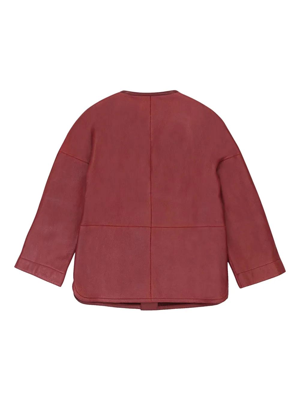 maroon front button fastening two front patch pockets collarless drop shoulder
