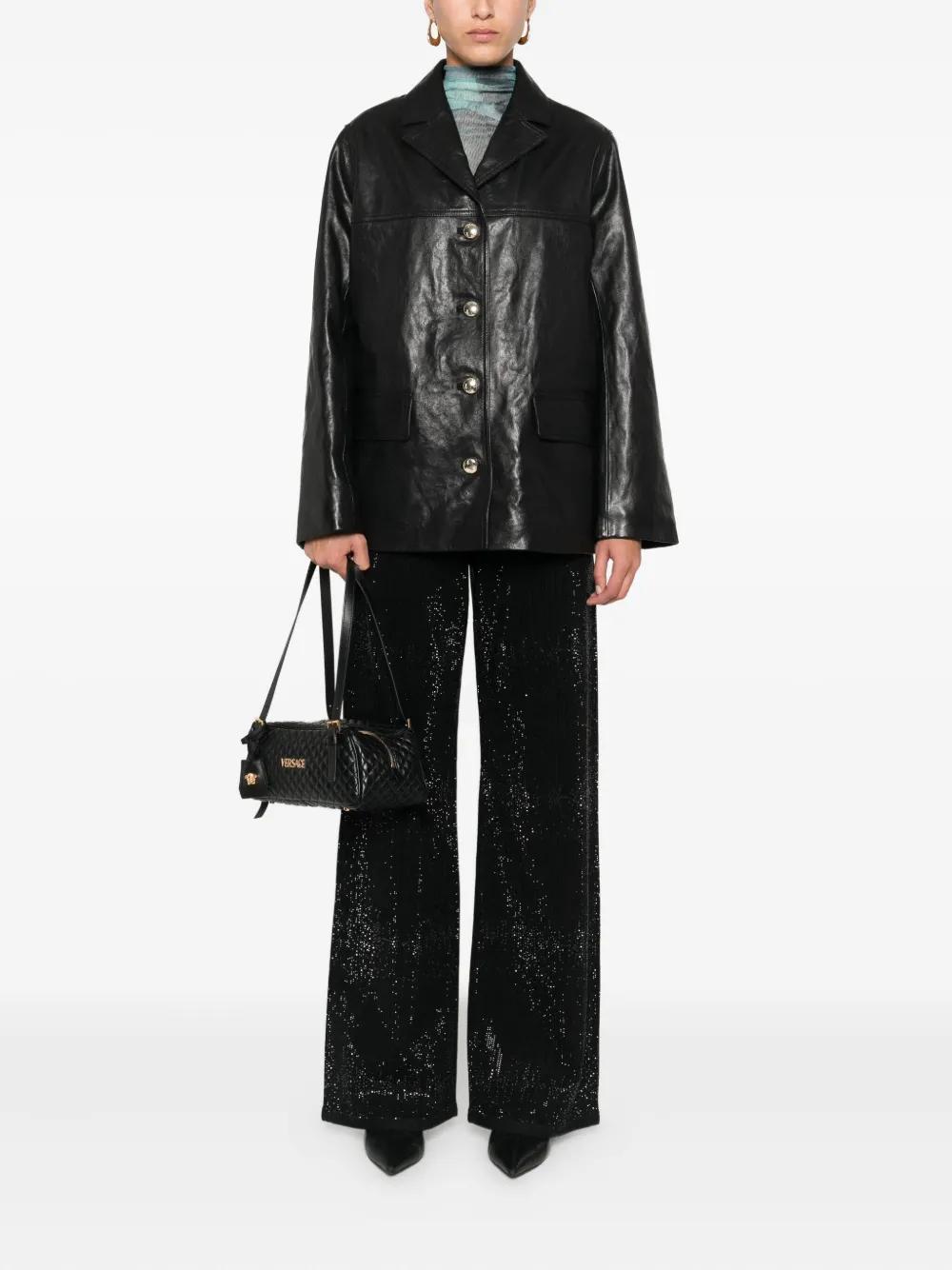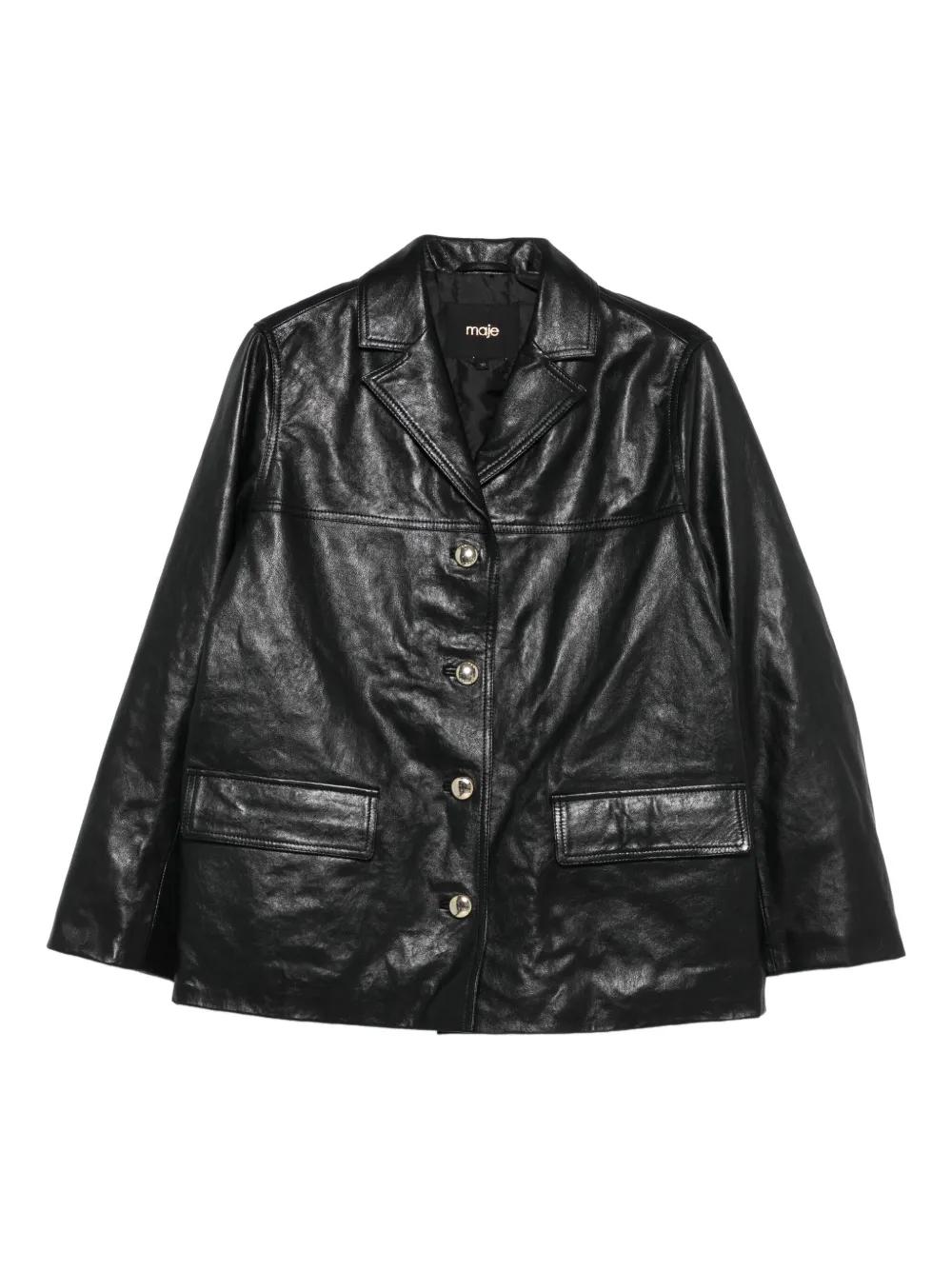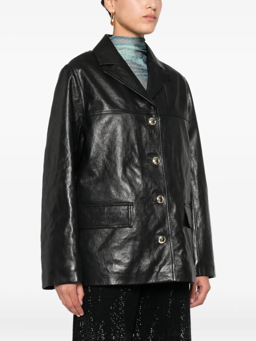 black leather button closure flap pockets notched lapels long sleeves straight hem