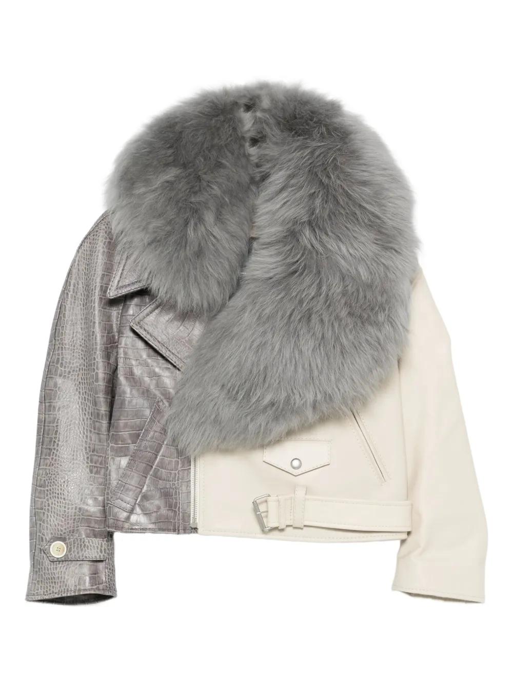 grey and white fur collar reptile effect buckle detail button fastening chest pocket