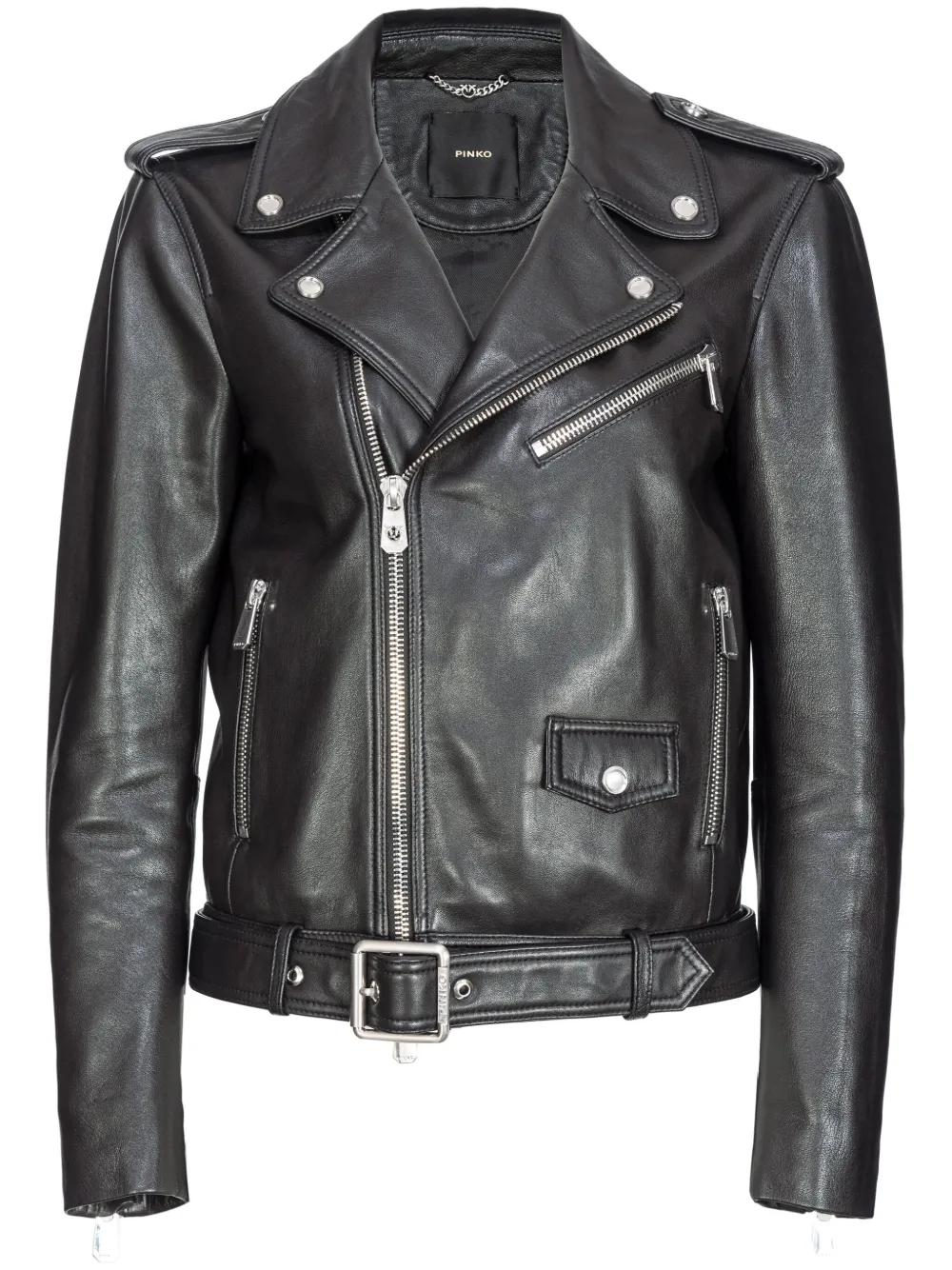 black leather notched lapels epaulettes long sleeves cuff zips two side zip-fastening pockets zip-fastening chest pocket belted waist straight hem