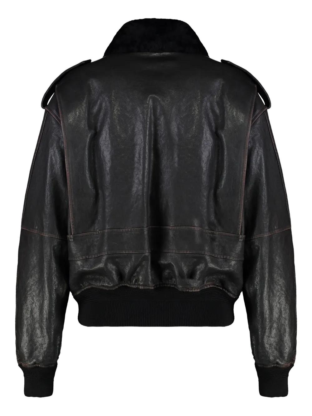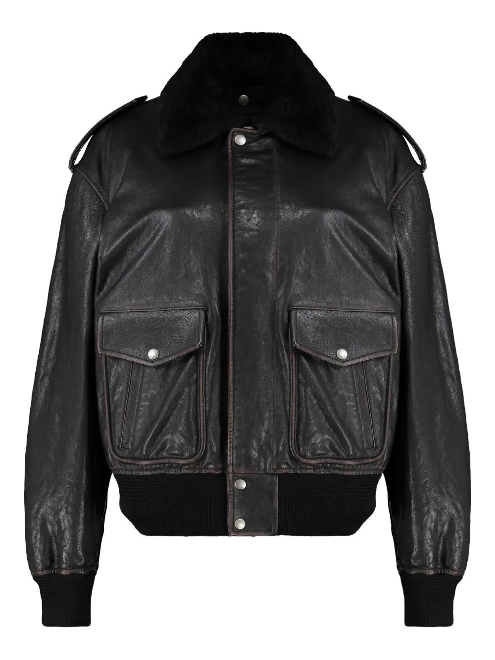 black lambskin leather shearling collar snap button fastening front pockets ribbed hem and cuffs