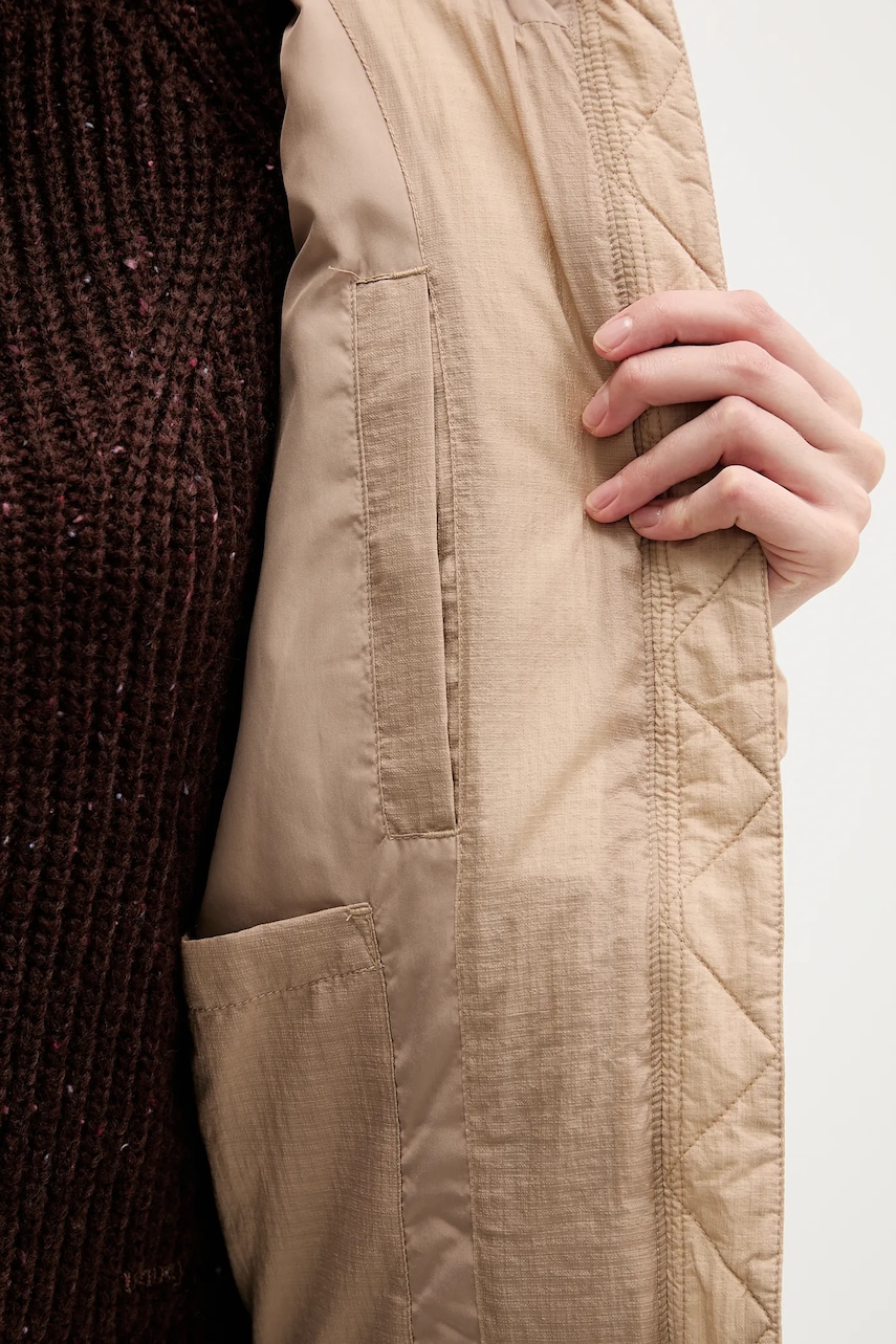 - Model zawiera włókna poliestru i poliamidu pochodzącego z recyklingu. - Prosty, nie blokujący ruchów fason. - Podwyższony kołnierz gwarantuje dodatkową ochronę przed chłodem. - Kaptur regulowany za pomocą troczka, zwiększa ochronę przed wiatrem i deszczem. - Krój rękawa z obniżoną linią ramion nie ogranicza mobilności. - Długie rękawy wykończone wygodnym, elastycznym ściągaczem. - Zapięcie na całej długości na suwak wyposażony w wewnętrzną klapkę przeciwsztormową. - Dwie wsuwane i zapinane na zatrzask kieszenie boczne. - Dodatkowa kieszeń wewnętrzna pozwala na bezpieczne przechowywanie drobiazgów. - Dolna krawędź wykończona troczkami ze stoperami, które dzięki możliwości regulacji obwodu dołu, zwiększają izolację od zimna. - Model wykonany ze wzmacnianej tkaniny ripstop, odpornej na uszkodzenia mechaniczne. - Długość rękawa: 60 cm. - Długość: 58 cm. - Szerokość pod pachami: 62 cm. - Szerokość w ramionach: 50 cm. - Wymiary podane dla rozmiaru: S.