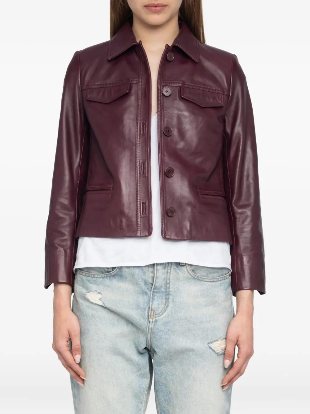 burgundy leather construction button fastening flap pockets notched collar long sleeves