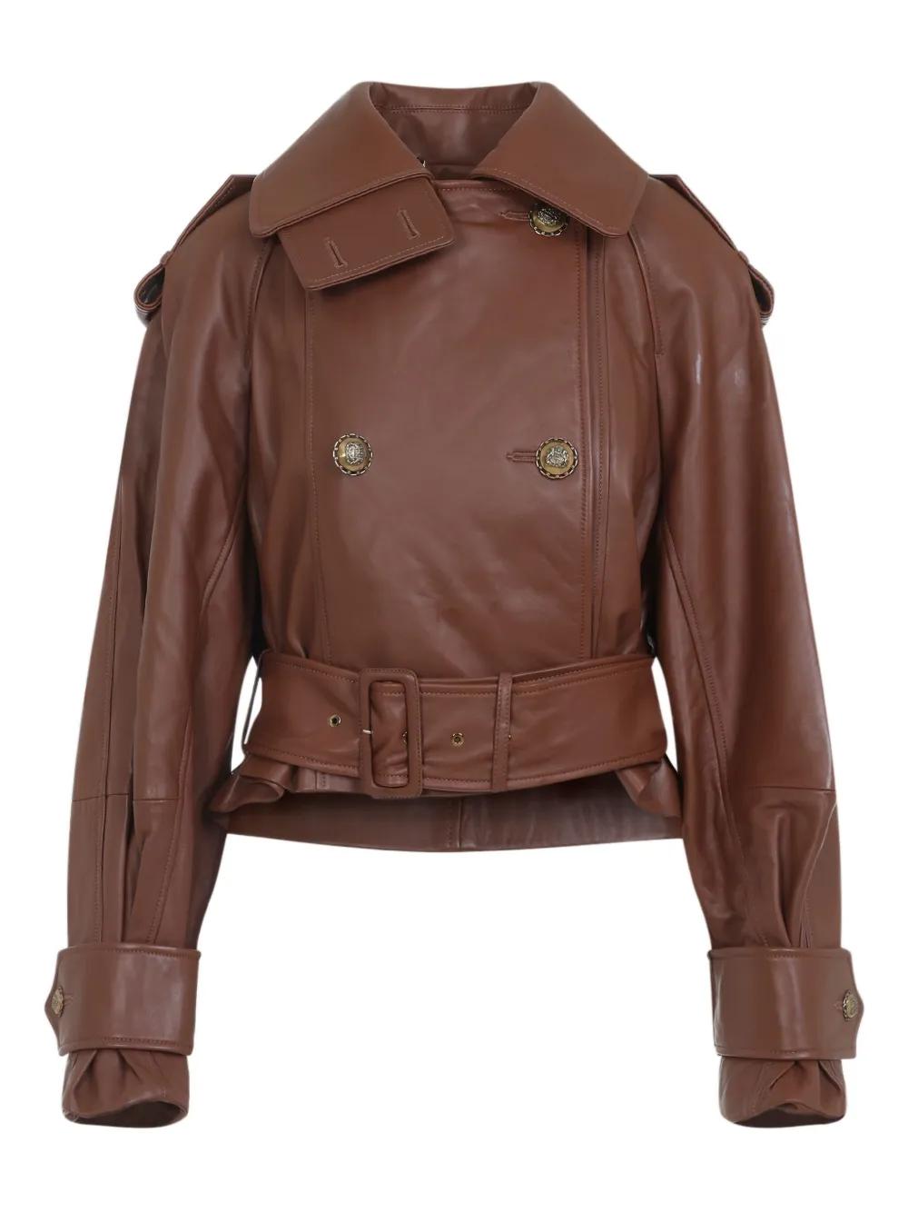 brown leather double-breasted design button fastening belted waist long sleeves buttoned cuffs
