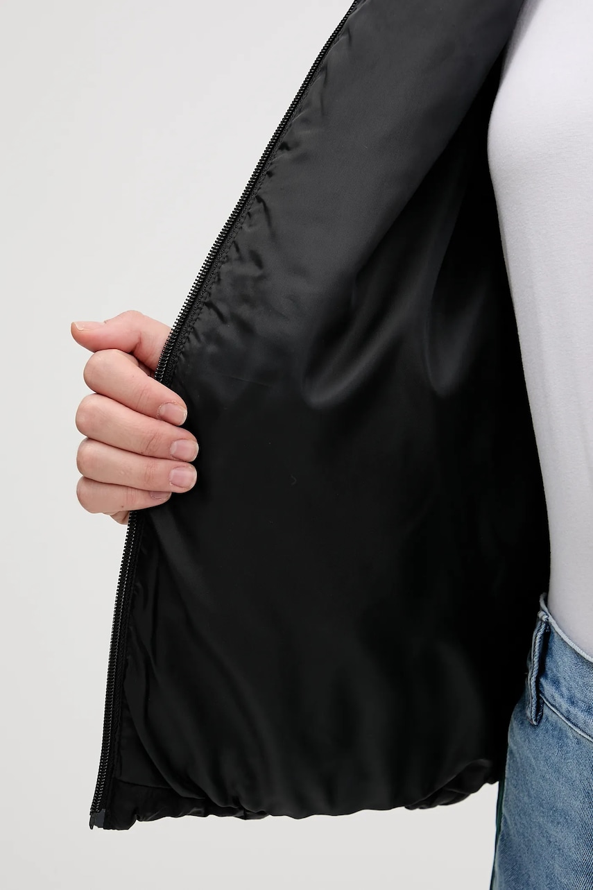 - Fason loose fit. - Ocieplony model na podszewce. - Zapięcie na suwak. - Model z kapturem. - Kaptur ściągany troczkami. - Dwie wsuwane i zapinane na zatrzask kieszenie boczne. - Długość rękawa: 59 cm. - Długość: 48 cm. - Szerokość pod pachami: 57 cm. - Szerokość w ramionach: 59 cm. - Wymiary podane dla rozmiaru: S.