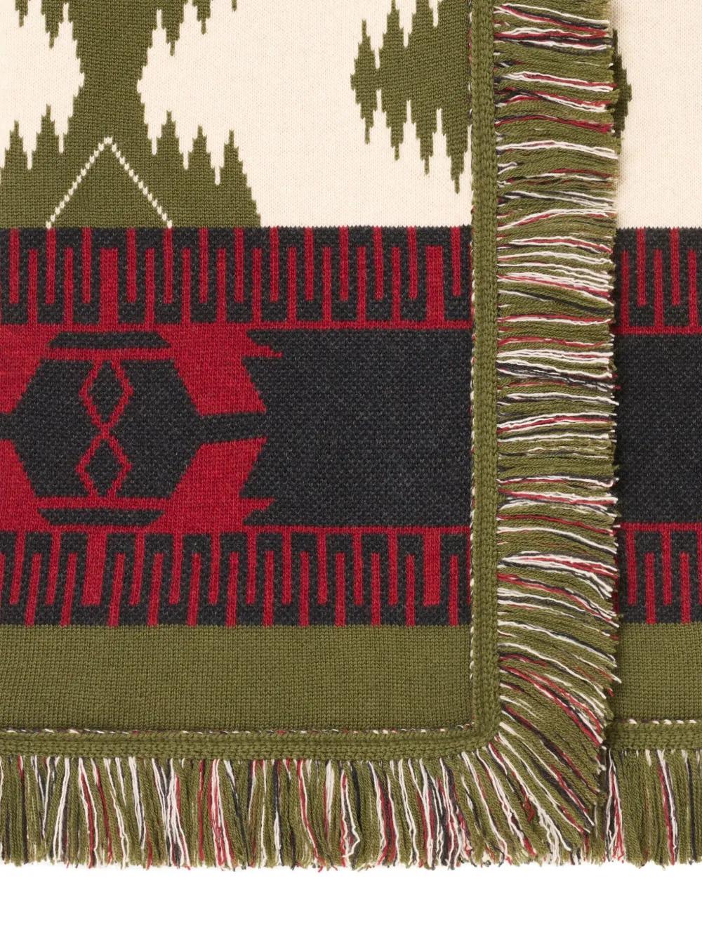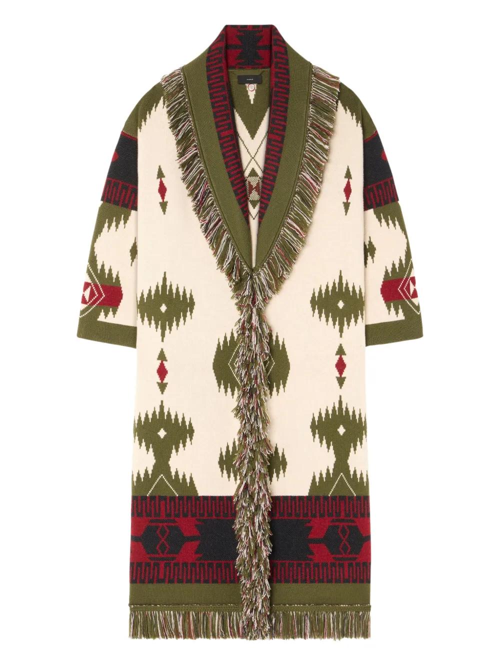 white geometric jacquard pattern fringed trim shawl collar detachable belt long sleeves wool