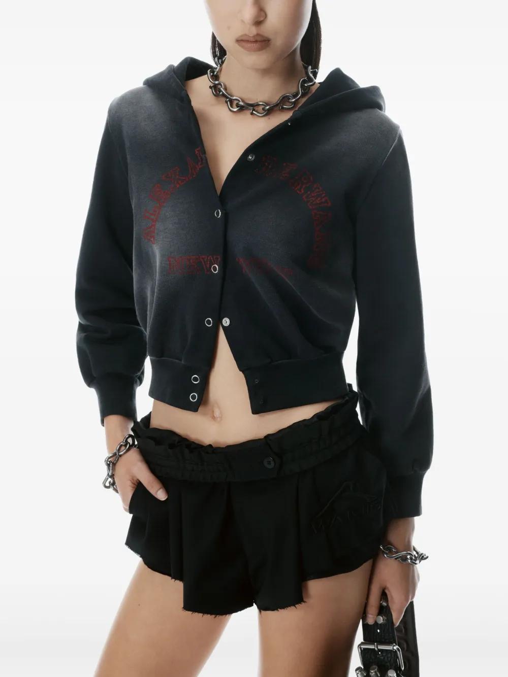 black front press-stud fastening classic hood graphic print to the front ribbed cuffs and hem