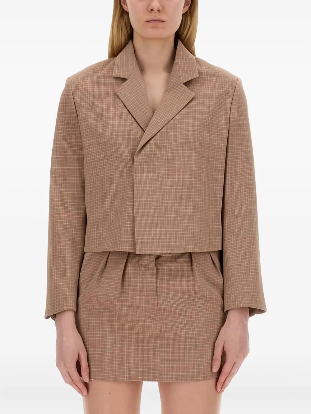 brown checked pattern notched lapel cropped length long sleeves button fastening