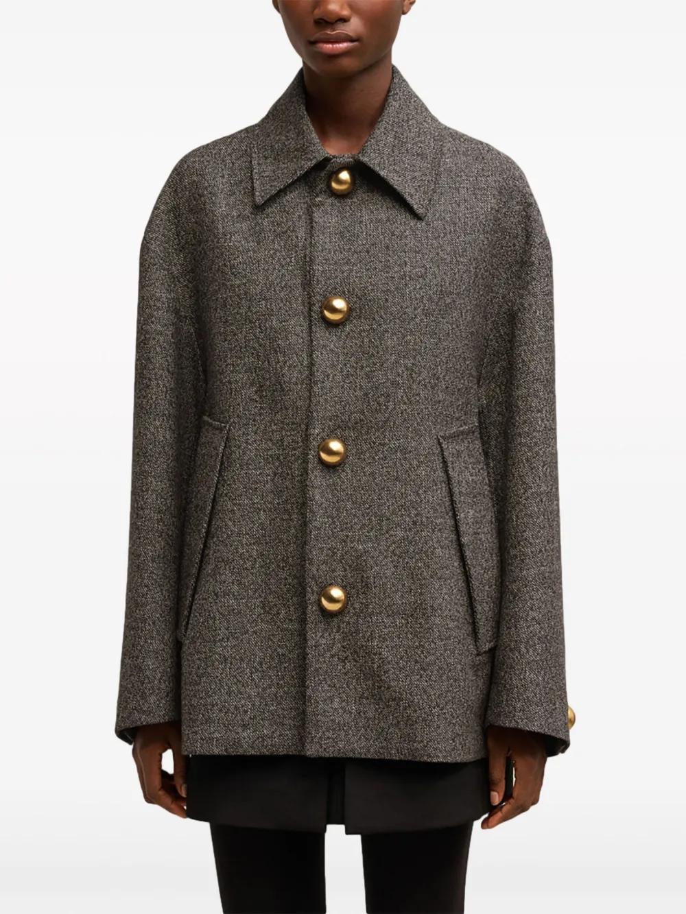 brown/white wool-cotton blend spread collar gold-tone buttons two side welt pockets belted waist long sleeves belted waist