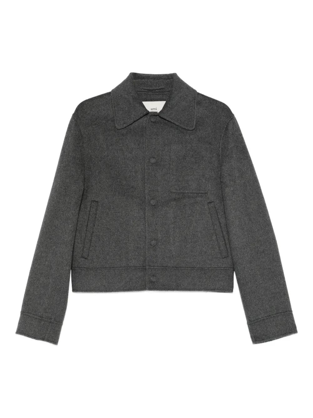 grey point collar front button fastening front patch pocket long sleeves buttoned cuffs