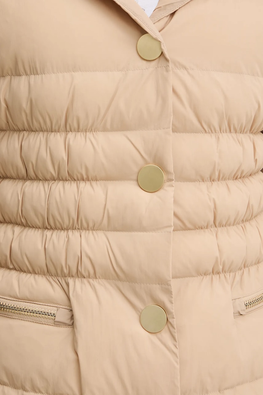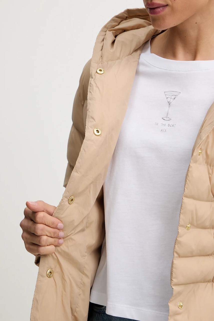 - Model z kapturem. - Pikowany model. - Ocieplony model na podszewce. - Jednorzędowe zapięcie na zatrzaski. - Dwie wsuwane i zapinane na suwak kieszenie boczne. - Długie rękawy wykończone wygodnym, elastycznym ściągaczem. - Długość rękawa: 61 cm. - Długość: 90 cm. - Szerokość pod pachami: 44 cm. - Wymiary podane dla rozmiaru: S.