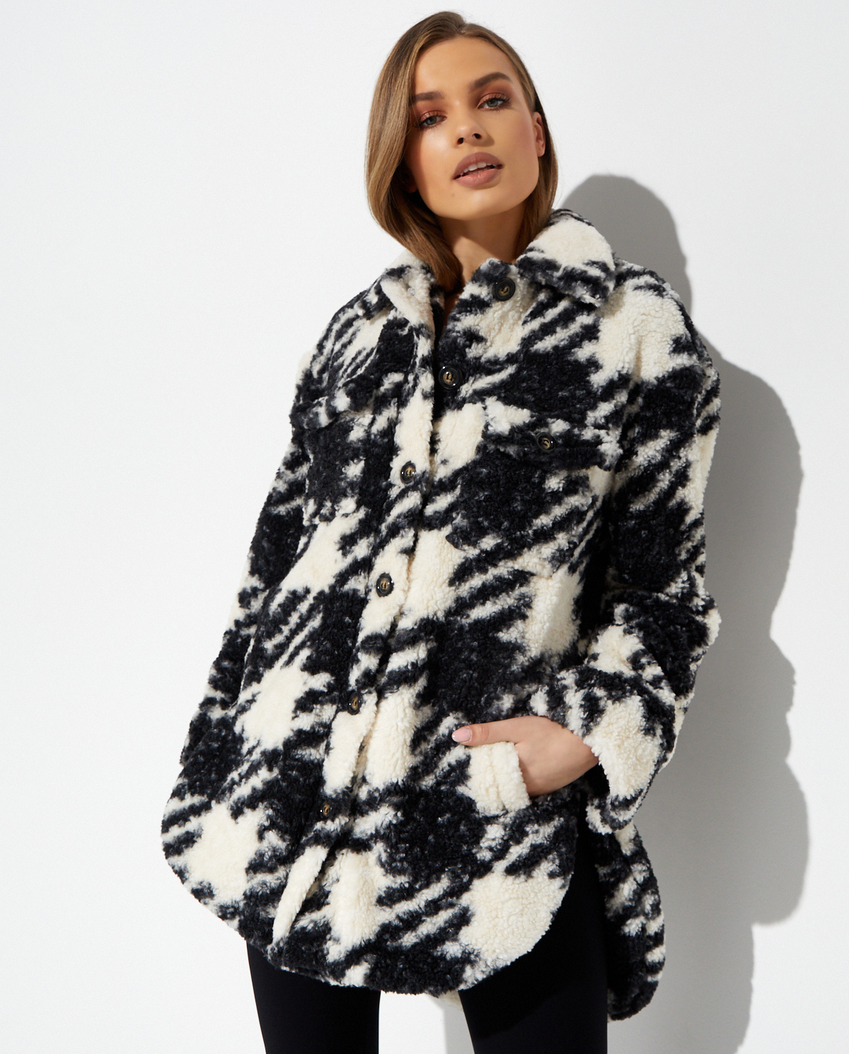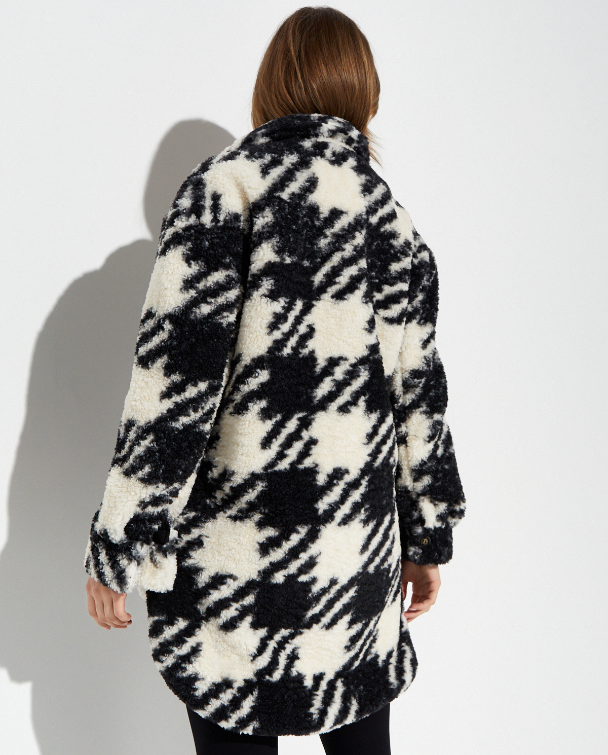 <ul> <li>damska kurtka marki Beach Riot California</li> <li>wz&oacute;r w pepitkę</li> <li>wykonana ze sztucznego futra</li> <li>długie rękawy, mankiety z guzikami</li> <li>luźny kr&oacute;j</li> <li>dwie kieszenie na wysokości klatki piersiowej</li> <li>zapinana na guziki</li> </ul>