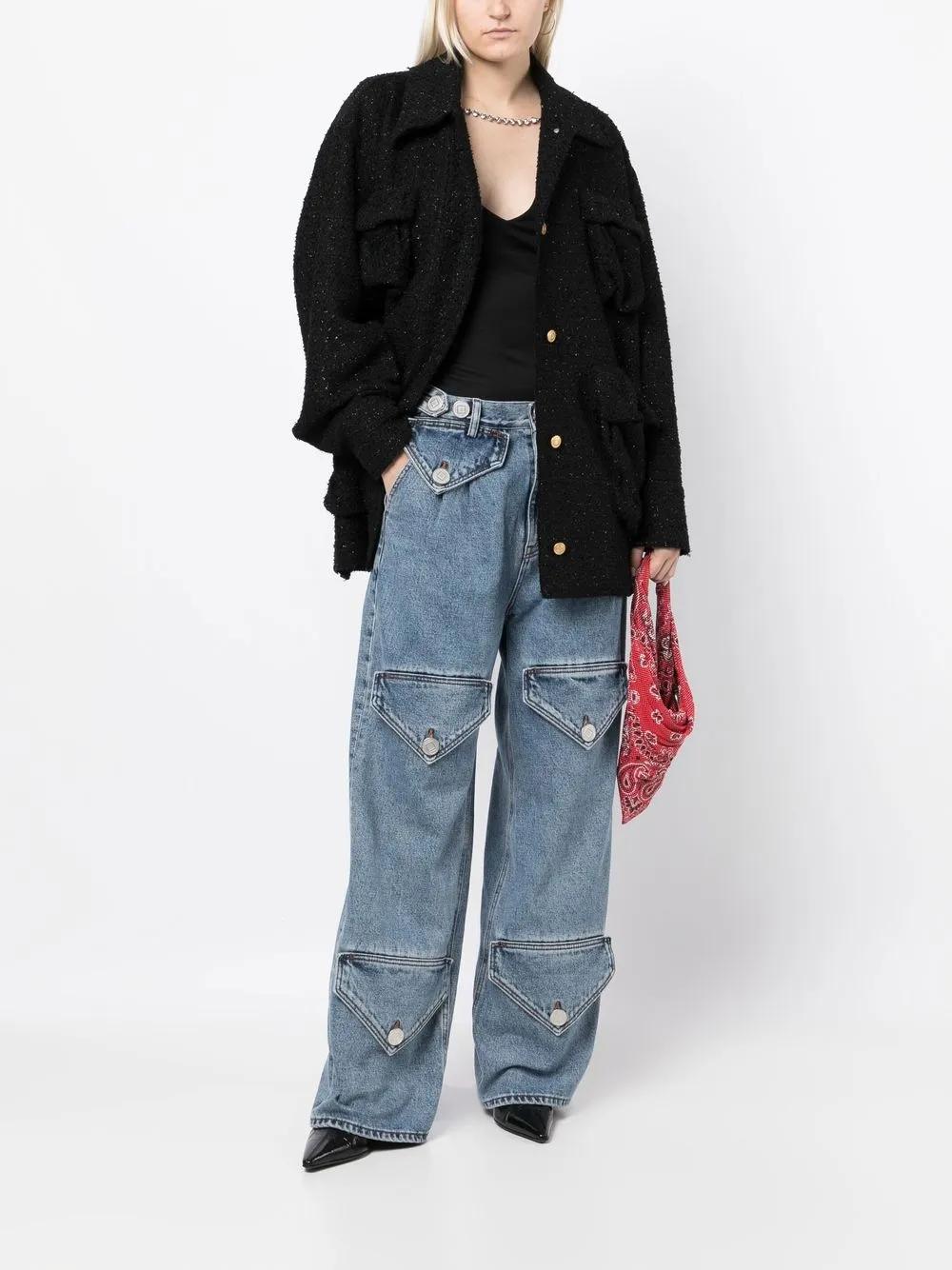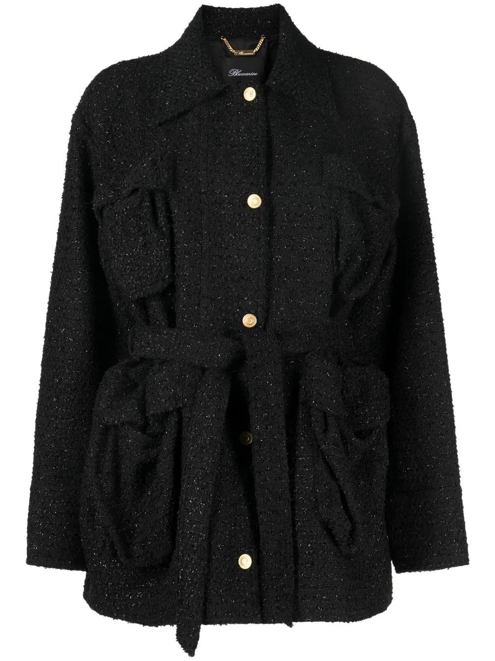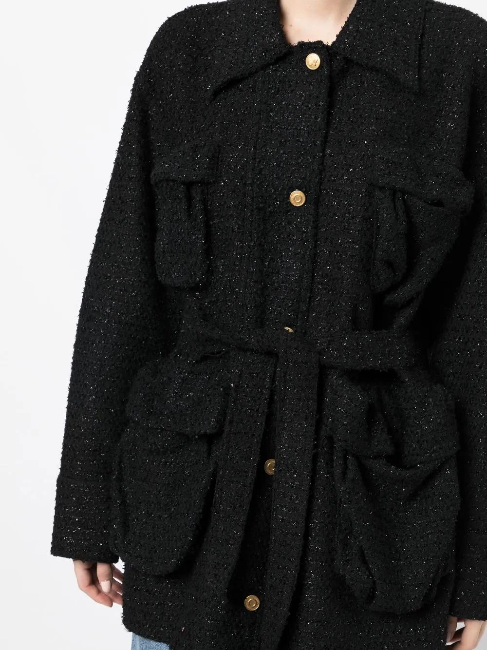 black cotton blend bouclé design classic collar front button fastening buttoned-cuff sleeves four front flap pockets tied waist