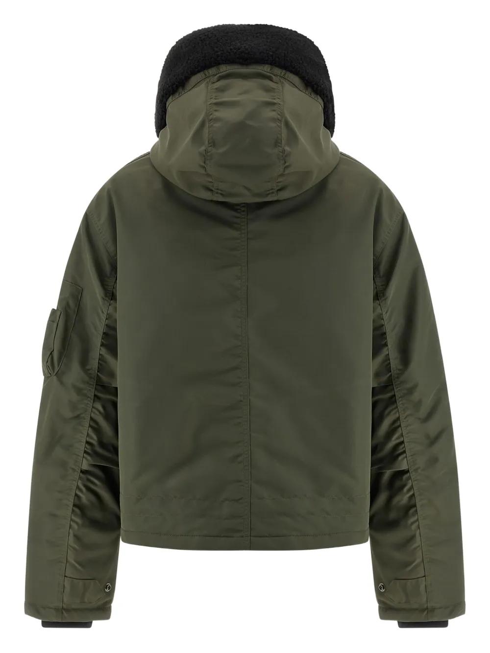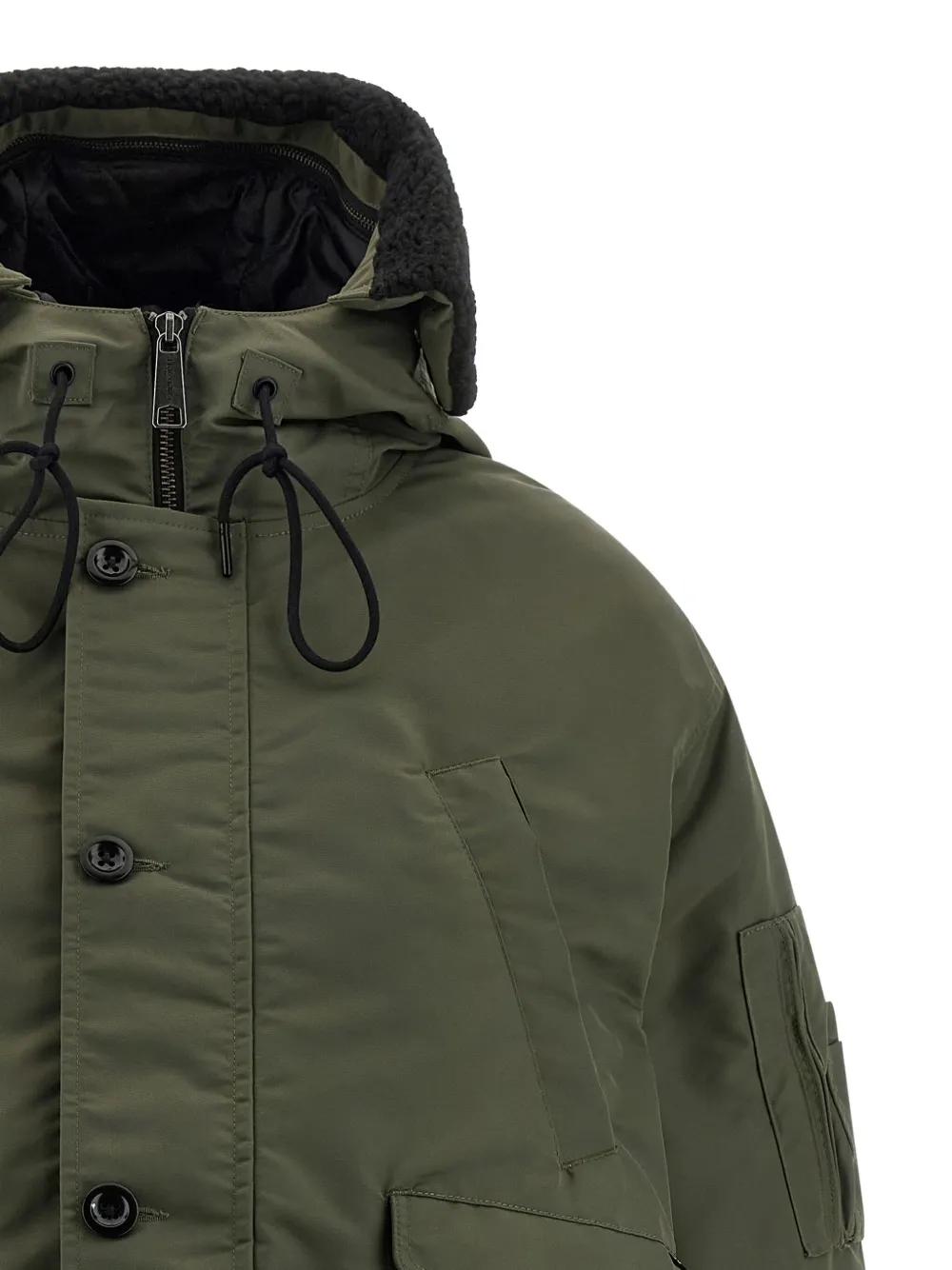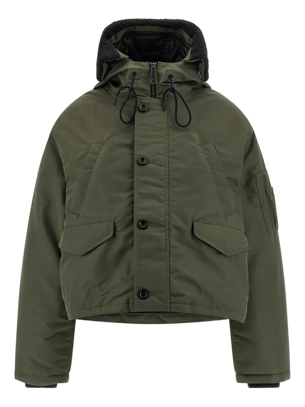 green adjustable hood removable fleece insert front zip and button closure stretch knit cuffs drawstring hem