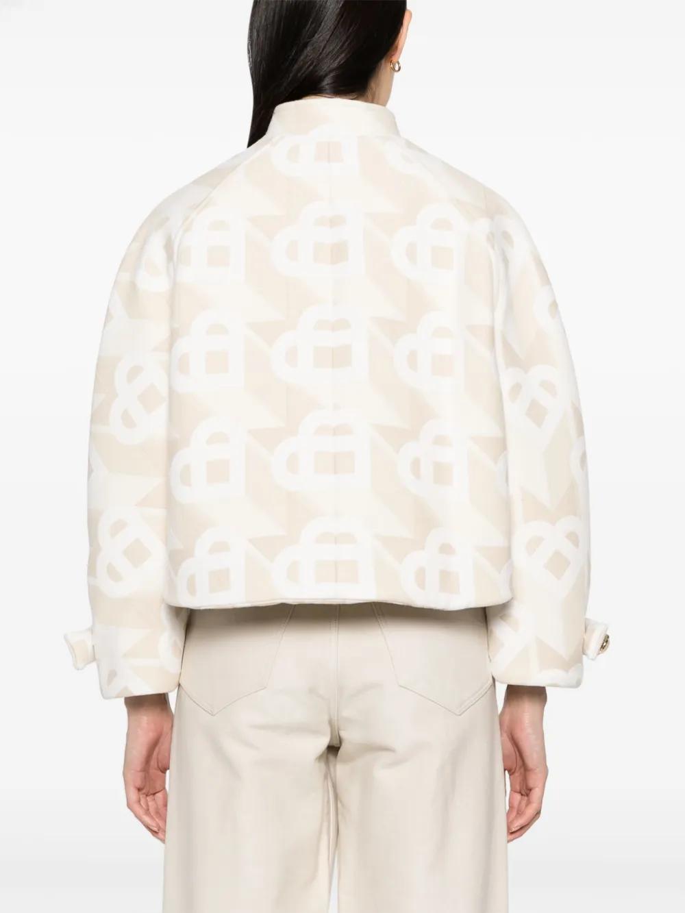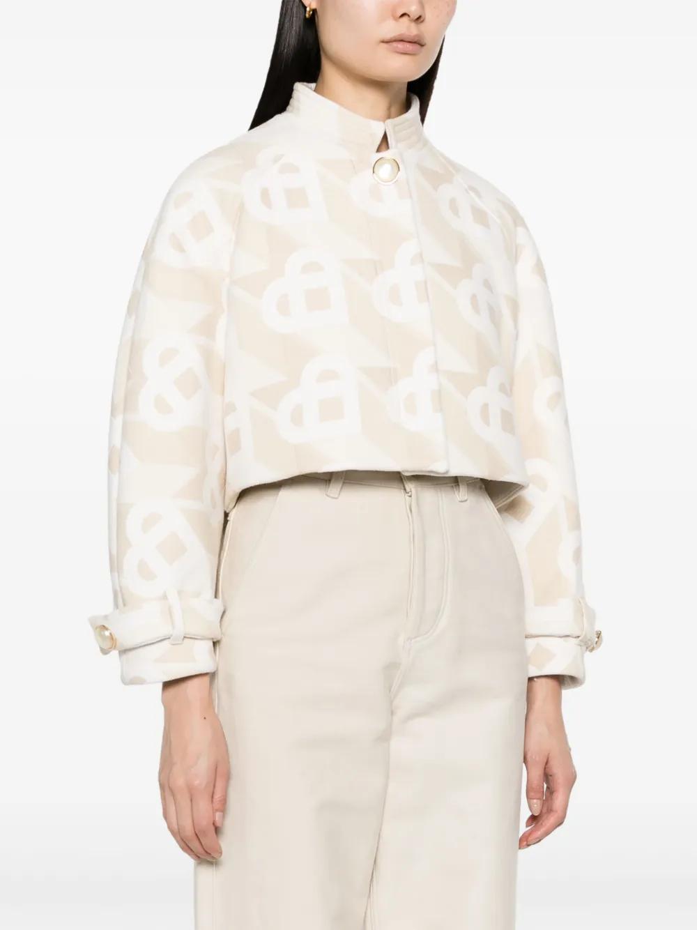 cream white/white virgin wool-cotton blend monogram pattern mother-of-pearl buttons ribbed trim long raglan sleeves belted cuffs concealed front fastening high-low hem cropped