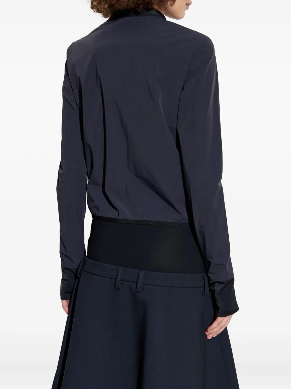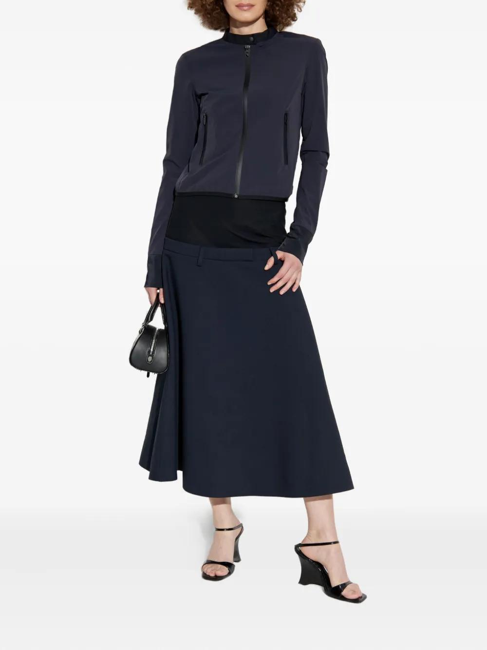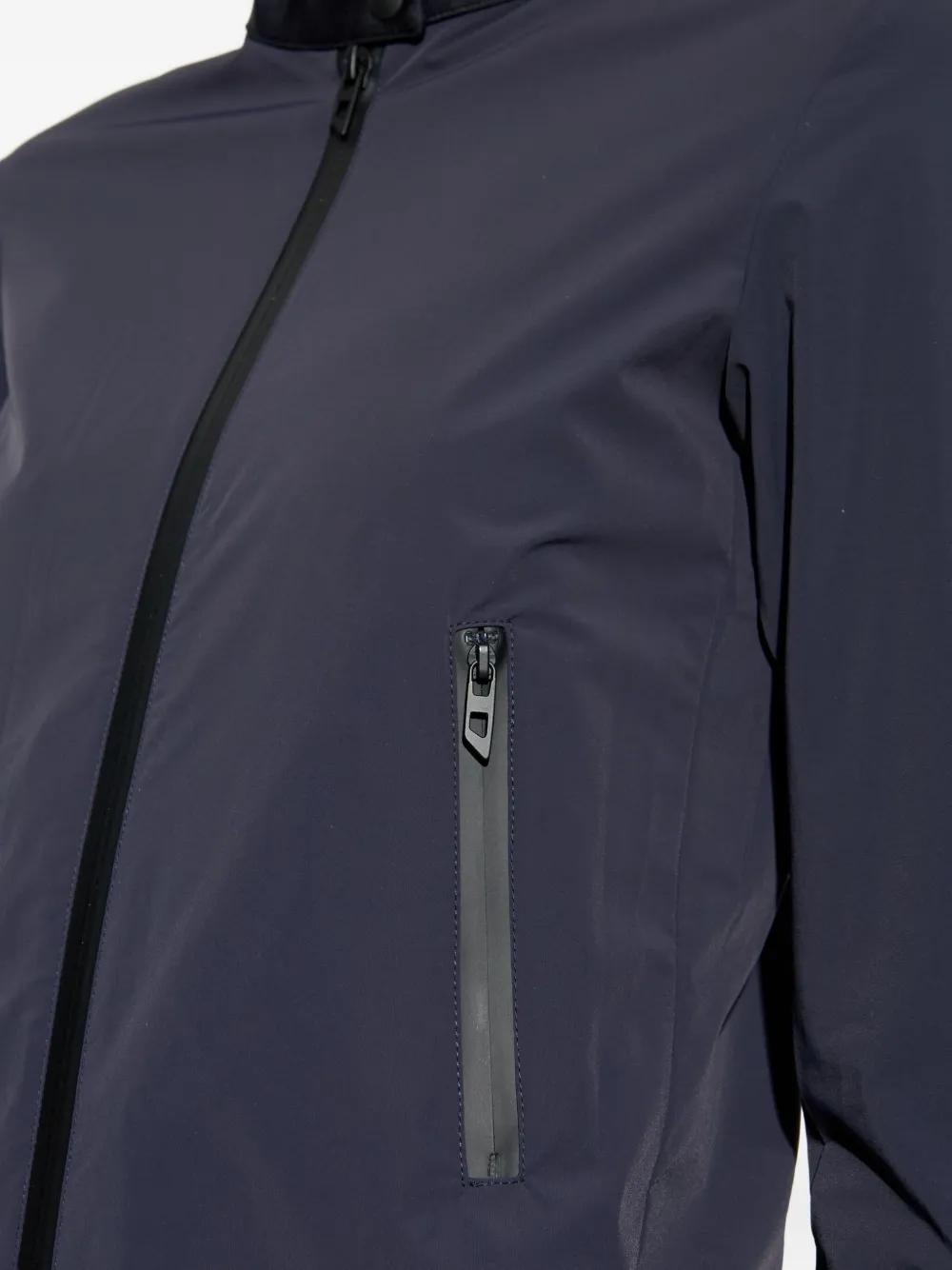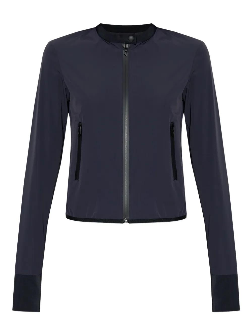 dark blue stand collar zip front fastening long sleeves welt pockets elasticated cuffs