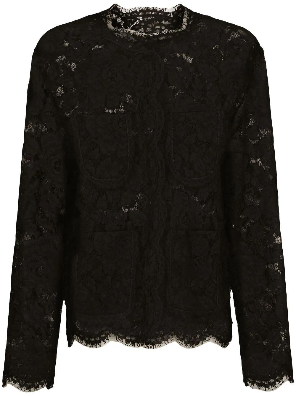 floral lace single-breasted jacket from DOLCE & GABBANA featuring black, cotton blend, floral-lace detailing, scallop edge, collarless, two chest patch pockets and two front patch pockets.