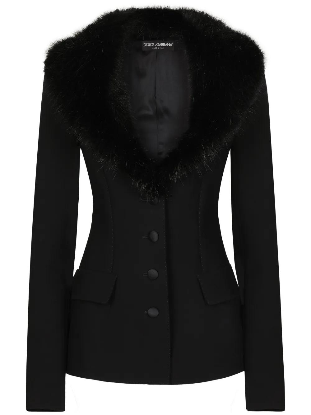 black faux-fur collar detachable collar long sleeves front button fastening two side flap pockets curved hem