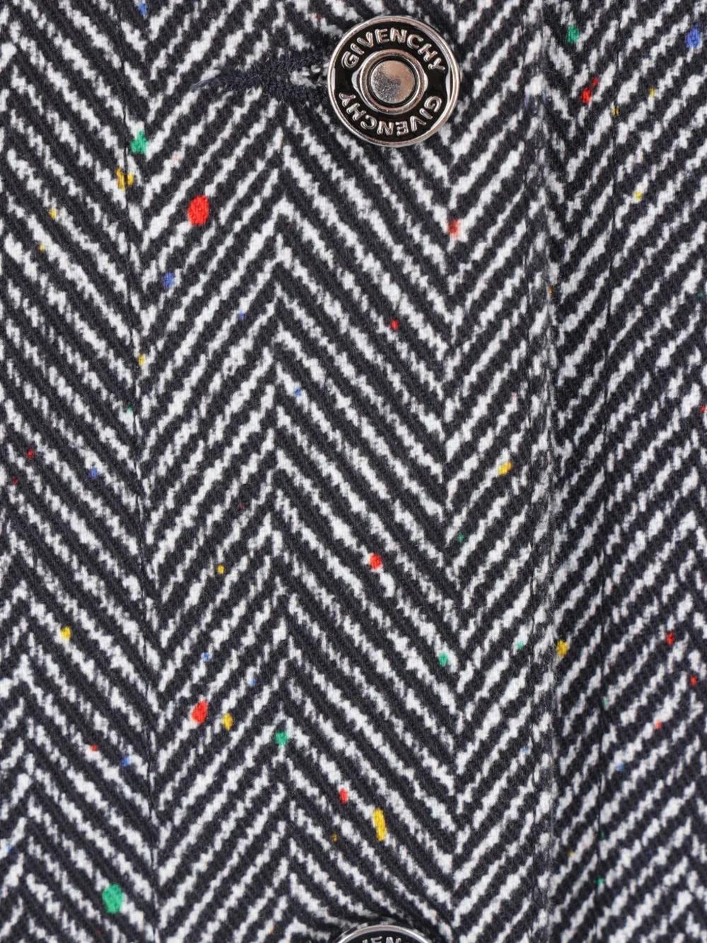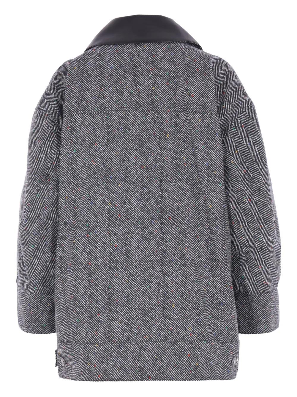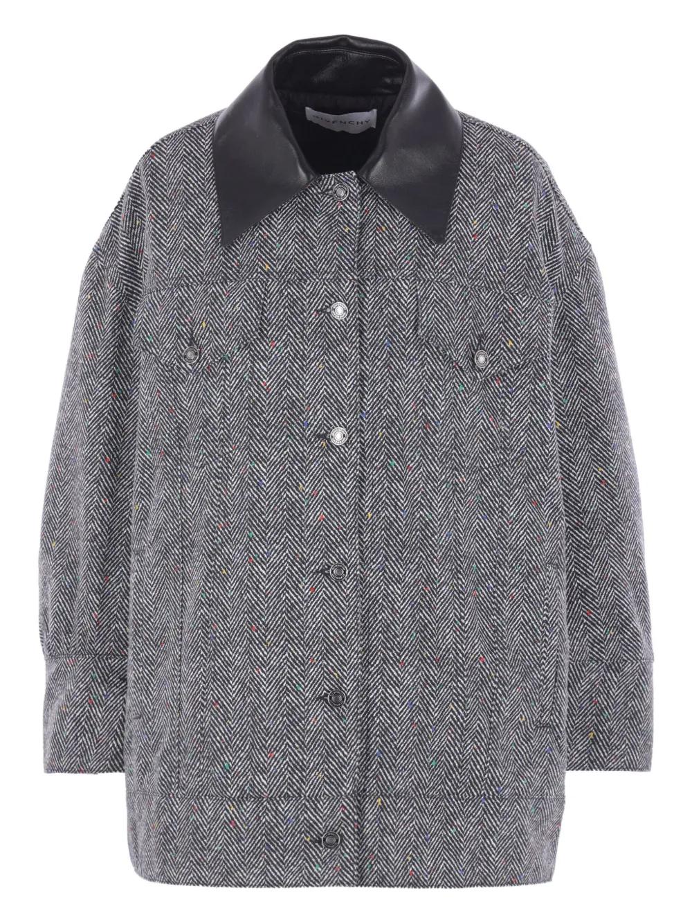 black herringbone pattern leather collar button fastening chest pockets buttoned cuffs
