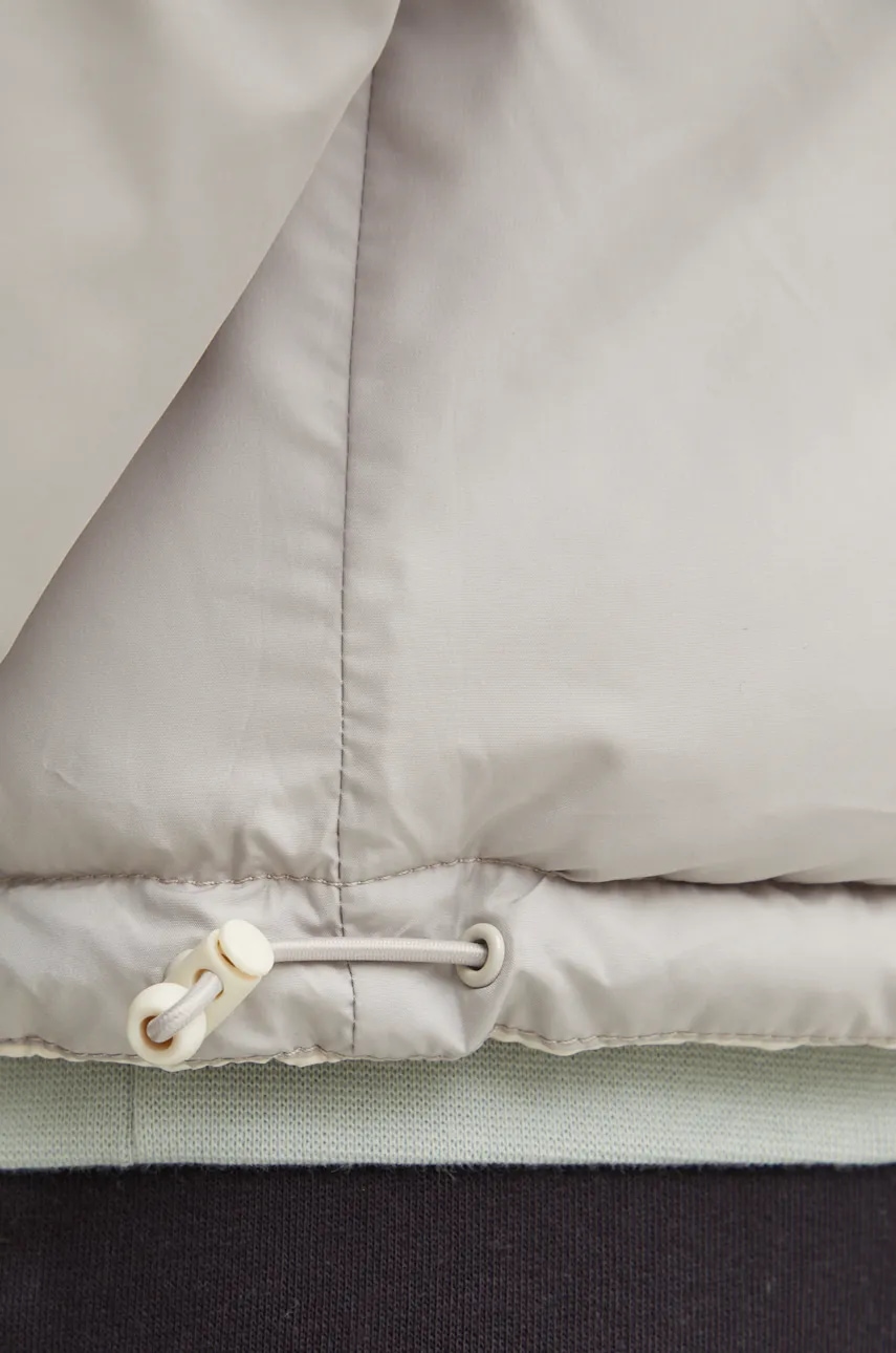 - Hydrofobowe wykończenie materiału, które nie zawiera perfluorowych substancji chemicznych (PFC), jest nietoksyczne, ekologiczne i zapewnia wodoodporność. - Wodoodporność oznacza podwyższoną odporność na działanie wody. Produkt w kontakcie z wodą zachowuje swoje właściwości, co pozwala na większy komfort użytkowania dzięki niższemu progowi przemakalności, nie gwarantuje jednak całkowitej wodoszczelności. - Model dwustronny. - Luźny krój zapewniający pełną swobodę ruchów. - Krój rękawa z obniżoną linią ramion nie ogranicza mobilności. - Rękawy wykończone ściągaczem. - Posiada zapięcie na suwak i podwyższony kołnierz. - Dwie wsuwane i zapinane na zatrzask kieszenie boczne. - Dolna krawędź wykończona troczkami ze stoperami. - Długość rękawa(mierzona od kołnierza): 73 cm. - Długość: 61 cm. - Szerokość pod pachami: 55 cm. - Wymiary podane dla rozmiaru: S.