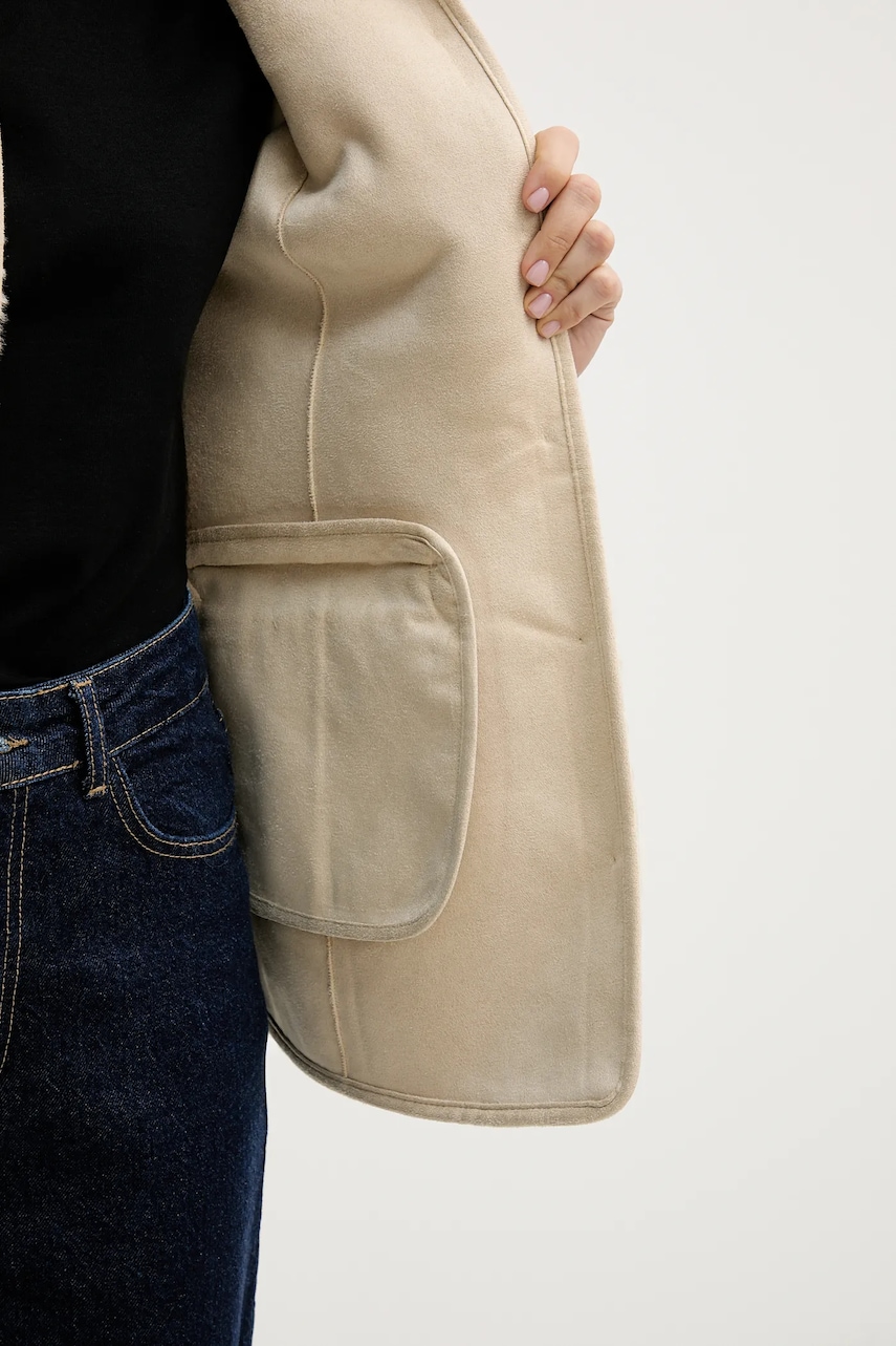 - Prosty, nie blokujący ruchów fason. - Zapięcie na guziki. - Dwie wsuwane kieszenie boczne.