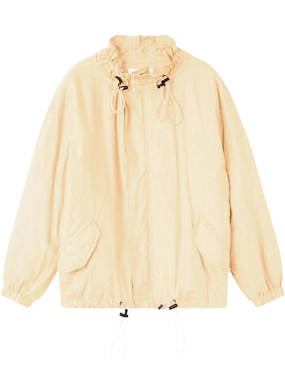 beige drawstring detailing zip fastening ruffled collar front flap pockets long sleeves elasticated cuffs elasticated hem