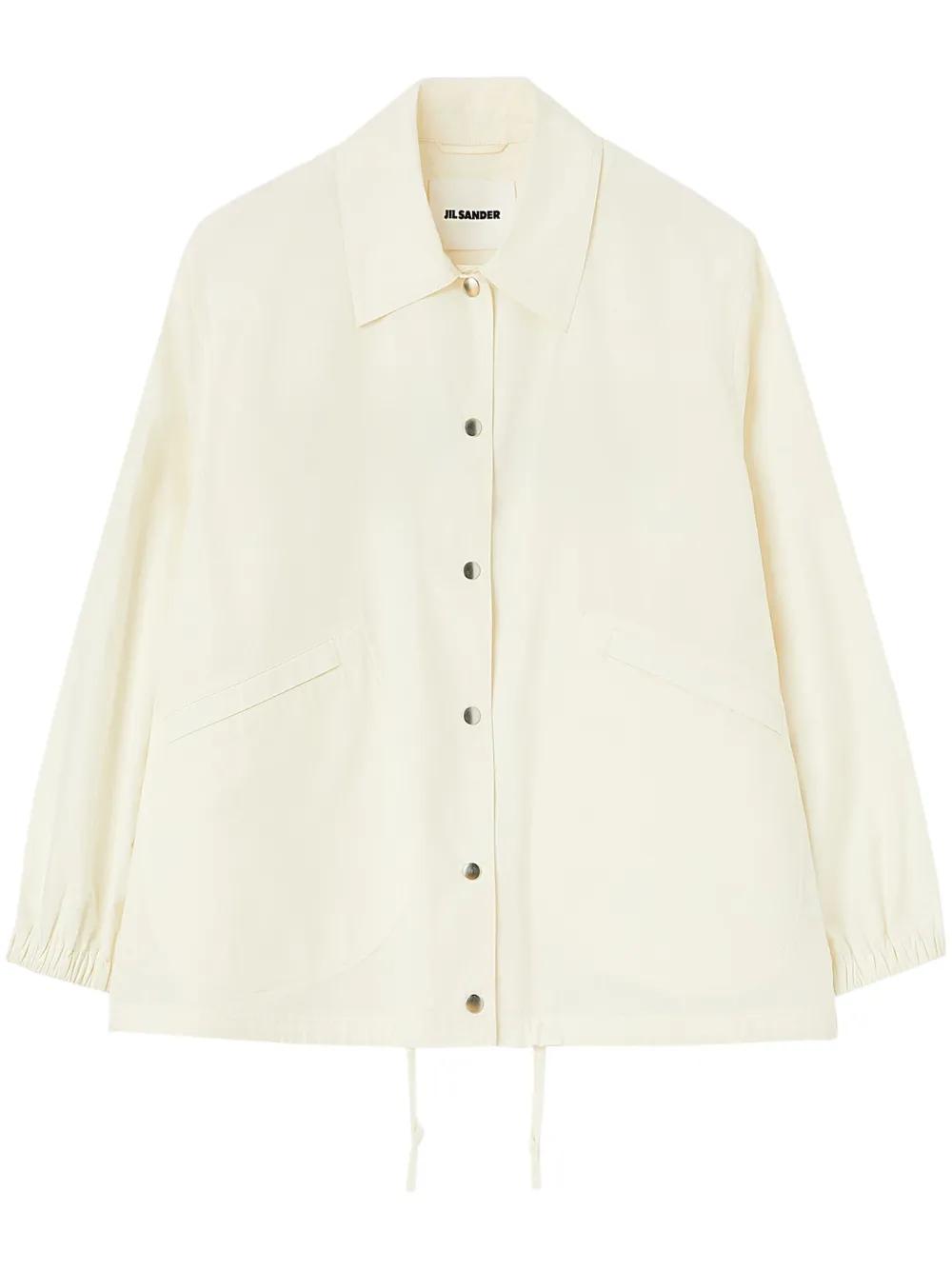 beige cotton logo print to the rear spread collar front press-stud fastening long sleeves with elasticated cuffs two diagonal pockets to the sides straight drawstring hem